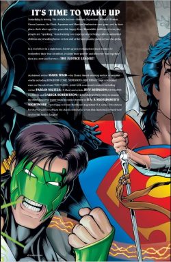 Amongst the ordinary mortals left behind are reporter Clark Kent, billionaire philanthropist Bruce Wayne, schoolteacher Diana Prince, college lecturer Wally West and corporate compliance officer Arthur Curry. Elsewhere, separated by immeasurable gulfs, scientist J’onn J’onzz leads an idyllic life under the skies of Mars with his wife and daughter…