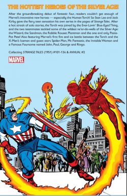 This captivating, esoteric and economical collection of pure 1960s superhero shenanigans gathers those eclectic but crucial yarns – no less than five major Marvel villains debuted in blistering battle against the Flaming Kid – between Strange Tales #101 – 134, as well as the lead tale from Strange Tales Annual #2 (spanning October 1962-July 1965).