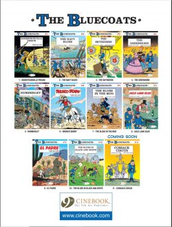 The Blues in Black and White was the 10th translated Cinebook album (chronologically the 11th European volume) and as Les Tuniques Bleues: Des bleus en noir et blanc was first seen on the continent in 1975, serialised in Le Journal de Spirou #1965 to #1975 before becoming an album collection two years later.