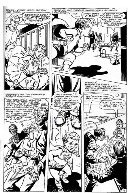 HoM #159 pitted The Human Starfish, Hypno-Man and super-powered toddler Mighty Moppet (wielding weaponised baby bottles) in single combats with a shape-shifting bandit gang dubbed ‘The Clay-Creep Clan’ whilst ‘The Wizard of Light’ played with the format by introducing a potential love-interest for Robby in his best friend’s cousin Suzy. It also saw the return of Giant-Boy, introduction of sugar-based sentinel of justice King Candy and the lad’s only transformation into an already established hero – Golden Age legend Plastic Man.
