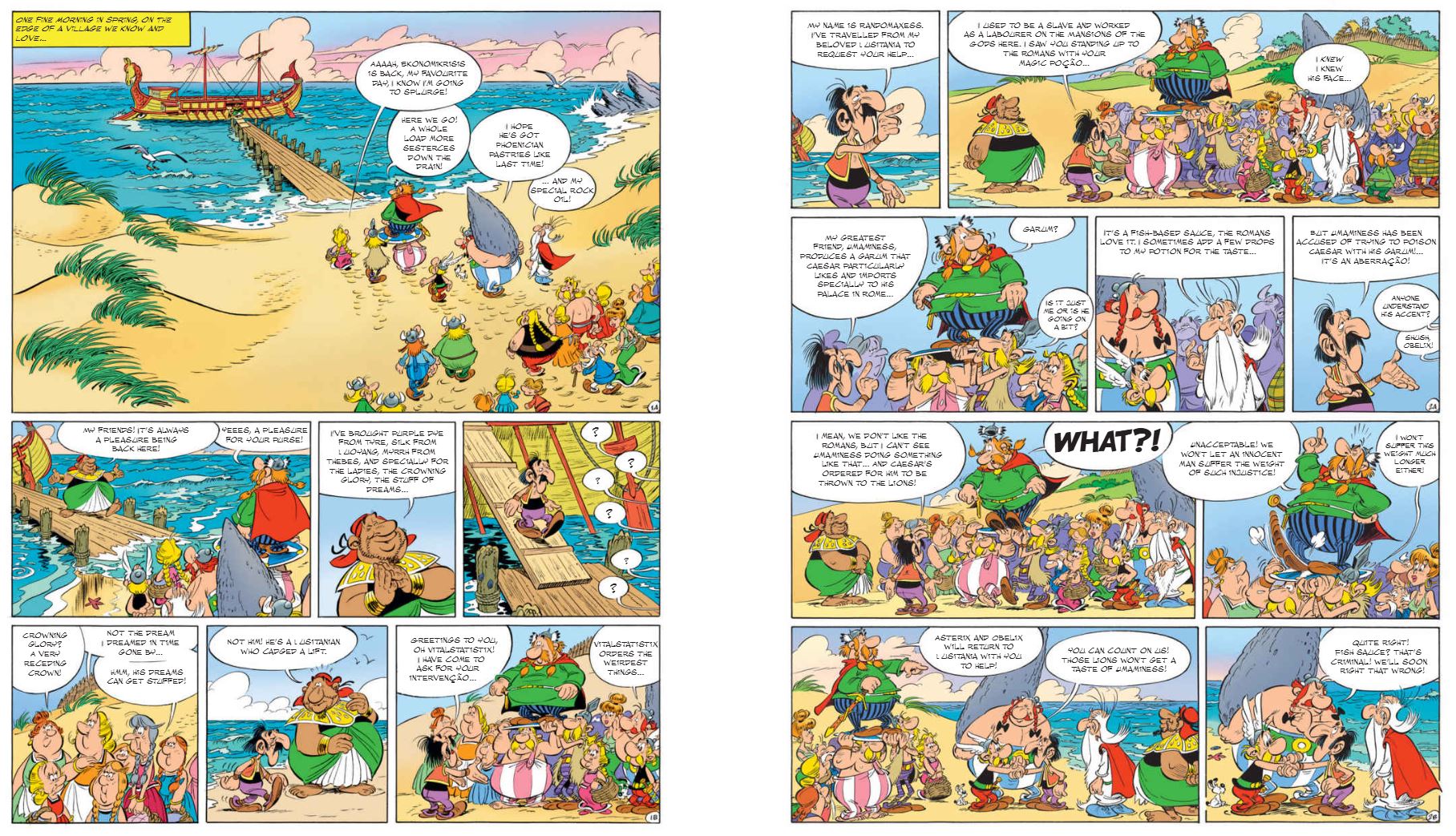 When Phoenician trader Ekonomikrisis arrives with his fabulous sea-borne wares, he also brings an old friend not seen since the affair of The Mansion of the Gods please link to Omnibus 6: Asterix in Switzerland, The Mansions of the Gods, Asterix & the Laurel Wreath April 25th 2019. However, weary Lusitanian Randomaxess is not here for a chinwag about old times. Rather, he’s on a mission of mercy due to his keen understanding of Gaulish adventure-seeking and taste for justice. His tale of skulduggery in the billion-sesterce fish sauce market is just what bored heroes want to hear…