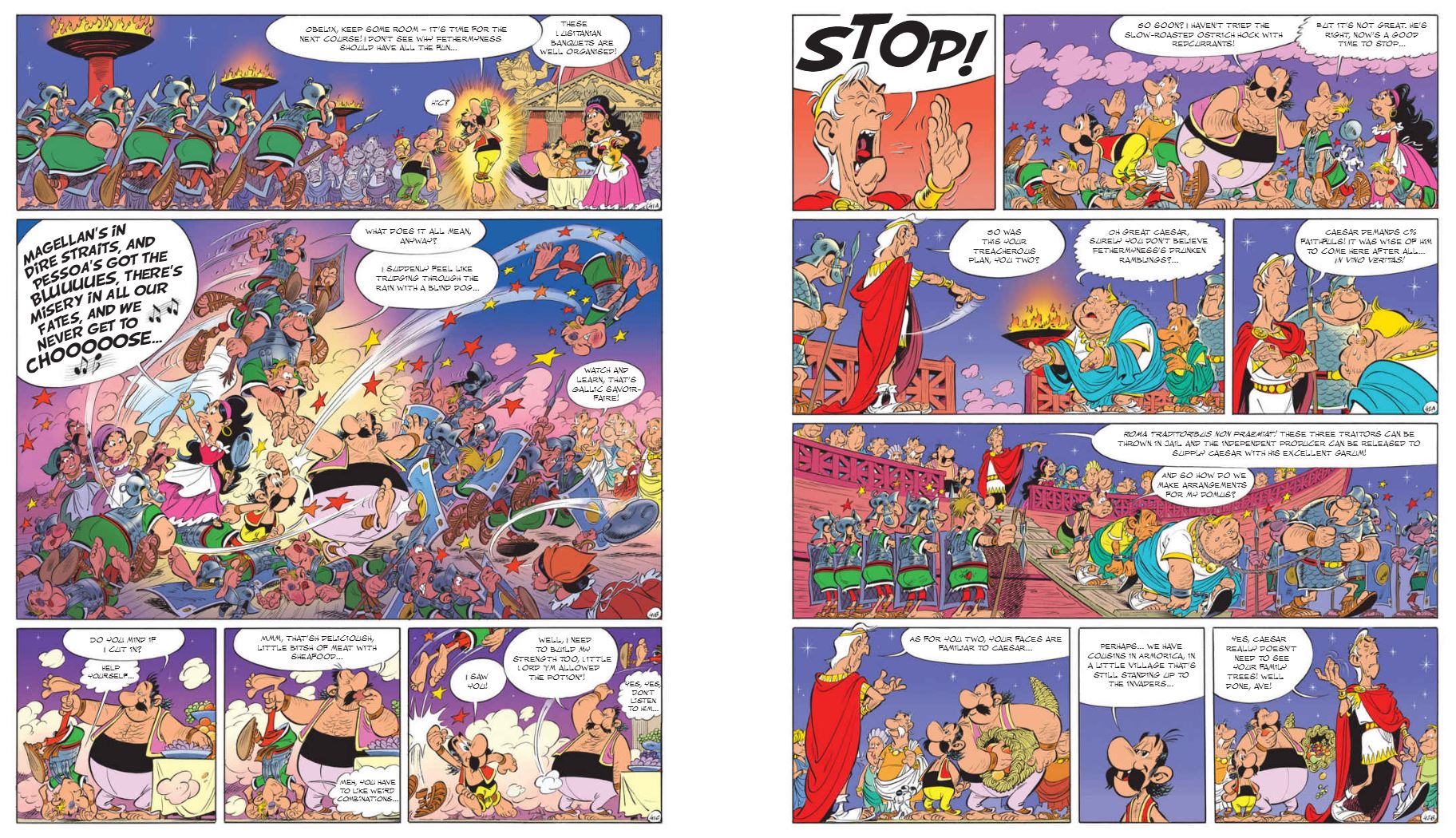 Impressionable Obelix may be distracted by trying to impress delicious Oxala, but does not falter or stir, even after having to embracing the dark side of the mission by going undercover and in disguise to expose the Governor’s plot. The job was always going to be tough, but everything goes well south when man-of-action Julius Caesar opts to personally investigate his attempted murder, culminating in a spectacular revelatory conclusion as Caesar’s state power smashes face-first into unchecked adventure capitalism during a do-or-die (possibly both) ceremonial banquet…