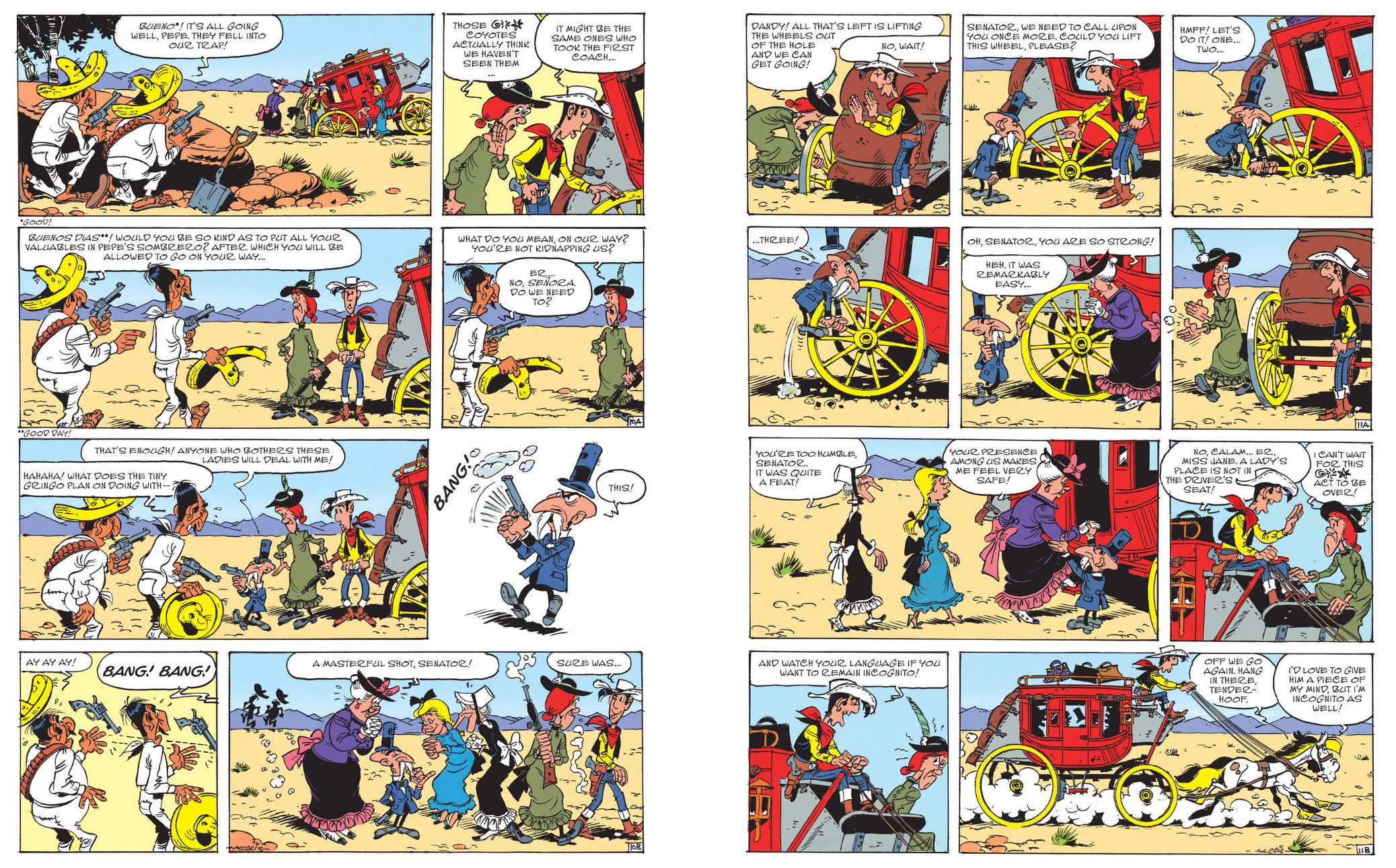 Next day – with Jolly Jumper harnessed up and disguised as a coach horse – Lucky steers the stage coach out, pondering on those passengers who have ignored ghastly rumours of kidnappers and griping of the many drivers who have suddenly called in sick…