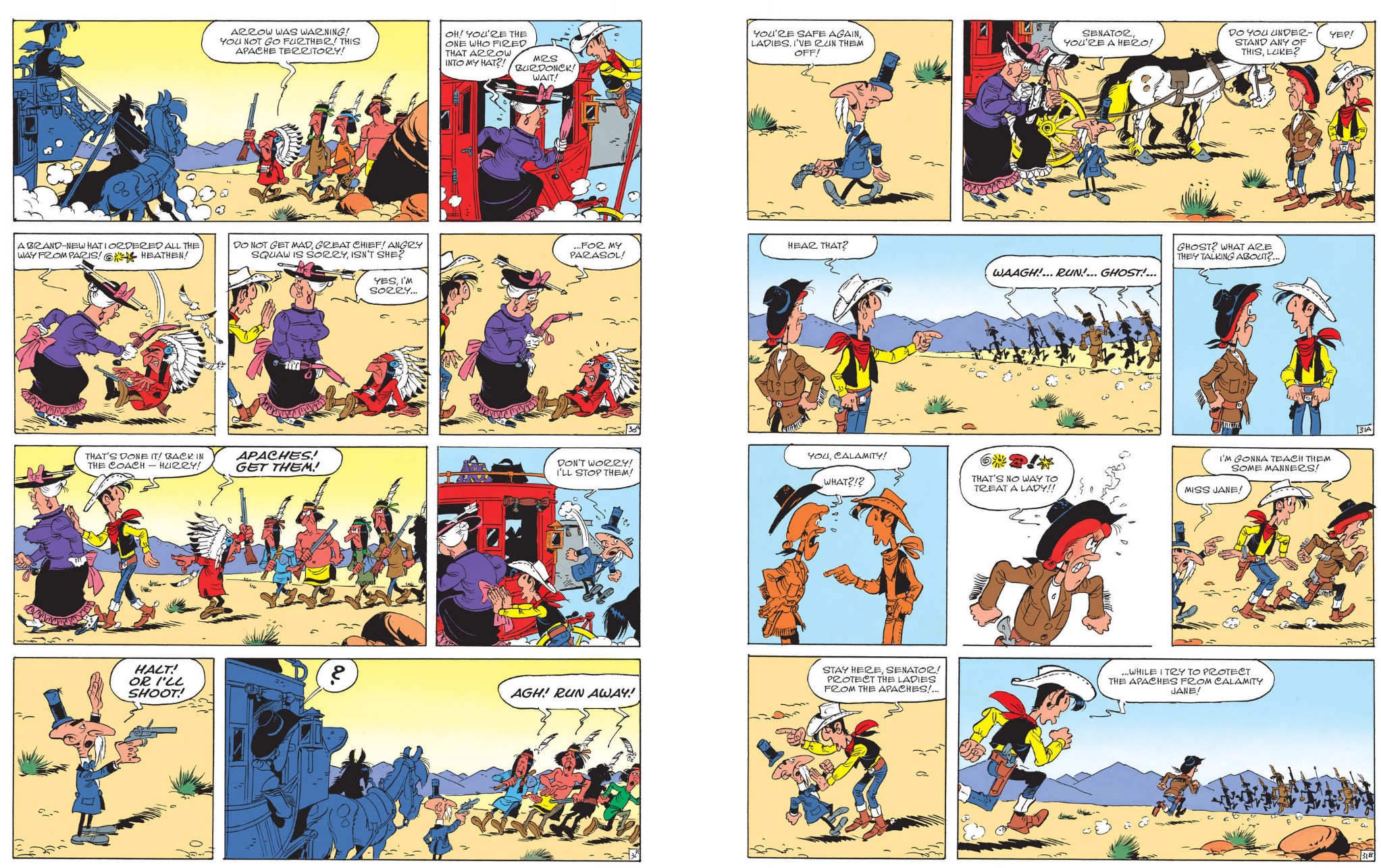 Following a number of failed robbery attempts – foiled by Lucky and the mean-mouthed old lady with the gun in her parasol – the coach arrives at the first staging post where Luke and Martha Jane Cannary compare notes. The Senator is clearly up to something as he’s ordered a change of route, but the largest part of the mystery is solved for them: explained by the station manager/bartender who reveals that the previous travellers were taken by a marauding spirit. The region of Phantom Valley is now an Indian reservation and Apache territory, but once upon a time the town of Doom was the home to hundreds of gold miners until the seam ran out. It was run by an awful creature: a bloodthirsty murdering harridan who killed or drove out everyone before dying in a gunfight and cursing the whole place with her last breath. Her name was Calamity Jane…