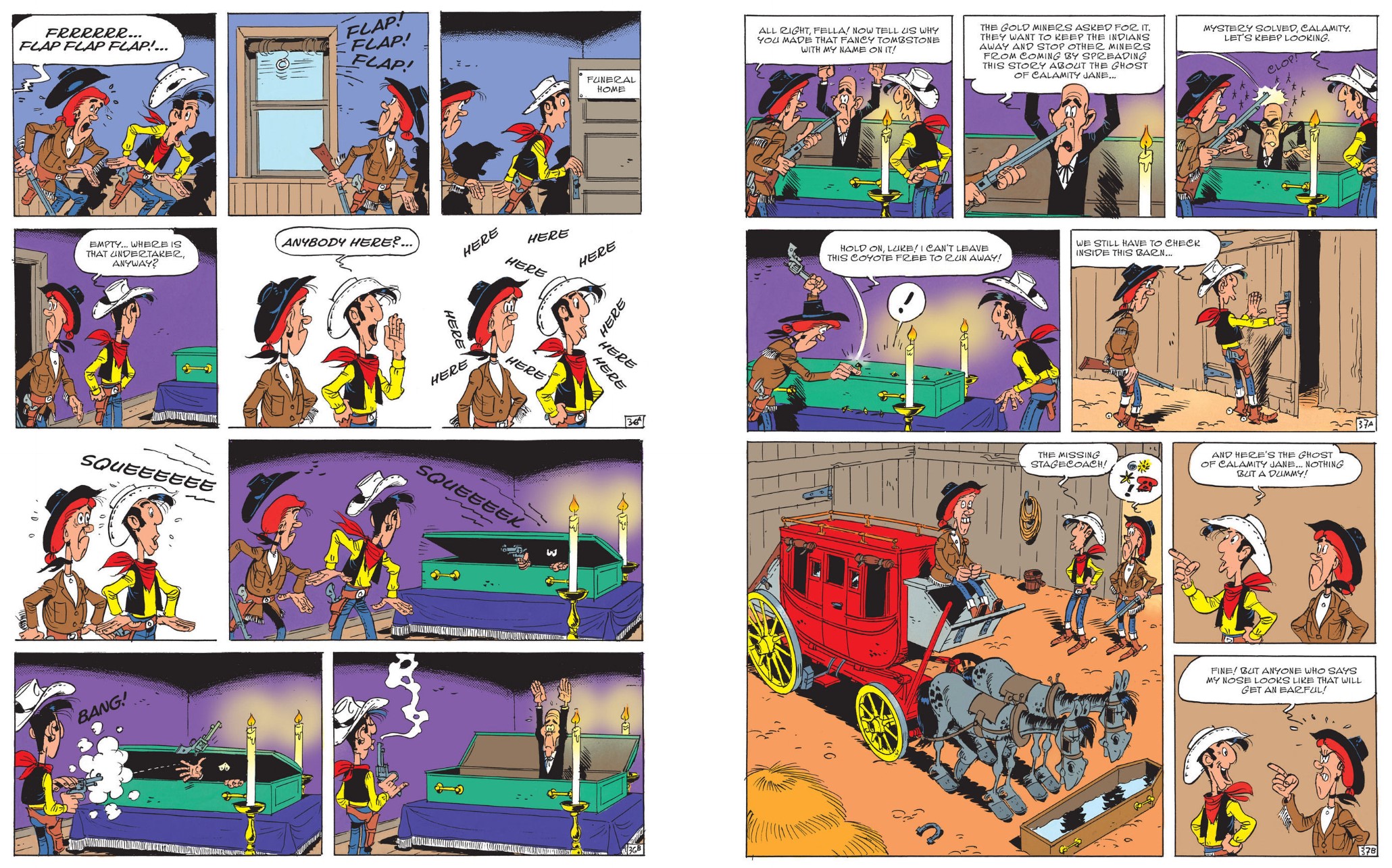 Cinebook’s 65th Lucky Luke album was officially the frontier phenomenon’s 61st European exploit, originally seen au continent in 1992 as Chasse aux fantômes. Visualised with verve by veterans Morris & van Banda it offers a guest-packed jaunty haunty jamboree blessed by the return of an extremely popular guest star…