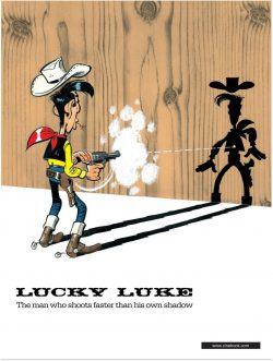 Doughty, dashing, dependable cowboy “good guy” Lucky is a rangy, implacably even-tempered do-gooder able to “draw faster than his own shadow”. He amiably ambles around the mythic Old West, having light-hearted adventures on his petulant and rather sarcastic wonder-horse Jolly Jumper. Over nine decades, his exploits have made him a top-ranking global comic character, filling nearly 90 individual albums and spin-off series like Kid Lucky and Ran-Tan-Plan, with sales upwards of 300 million copies in 30 languages. That renown translated into a mountain of merchandise, toys, games, animated cartoons, TV shows and live-action movies and even commemorative exhibitions. No theme park yet, but you never know…