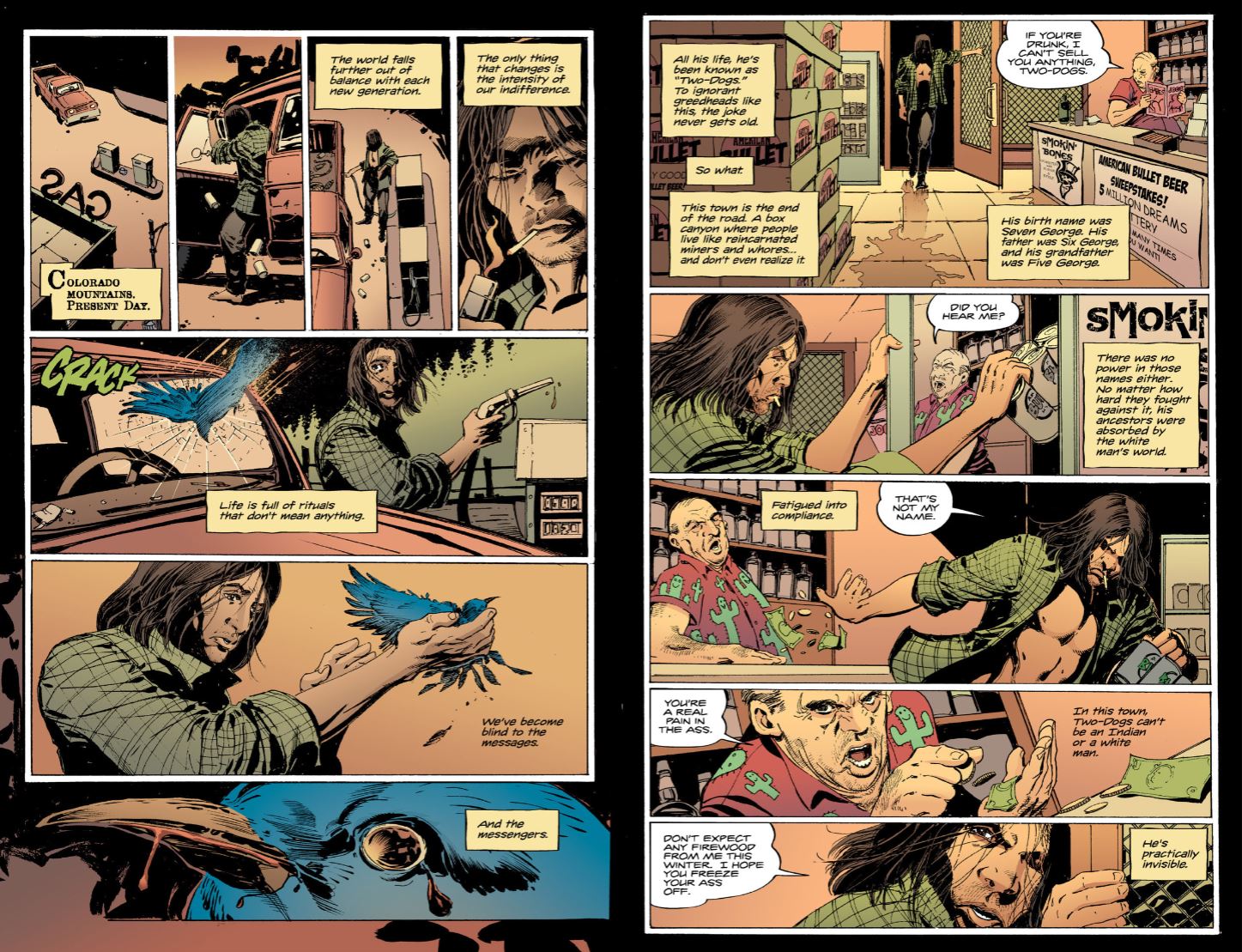 More than a century later, drunk, lost and perpetually angry Native American Seven George (his true name is Two Dogs…) continues being a pain in the ass to everybody. Yet again, sheriff Jim Shipps gives the kid a pass, but by the time the young man reaches his desolate, dilapidated shack, he’s become aware that something’s changed: an unnatural alteration that’s killing all the birds. Thankfully, he knows the history and takes steps to protect himself from an interrupted ritual that’s coming back and coming to a close…