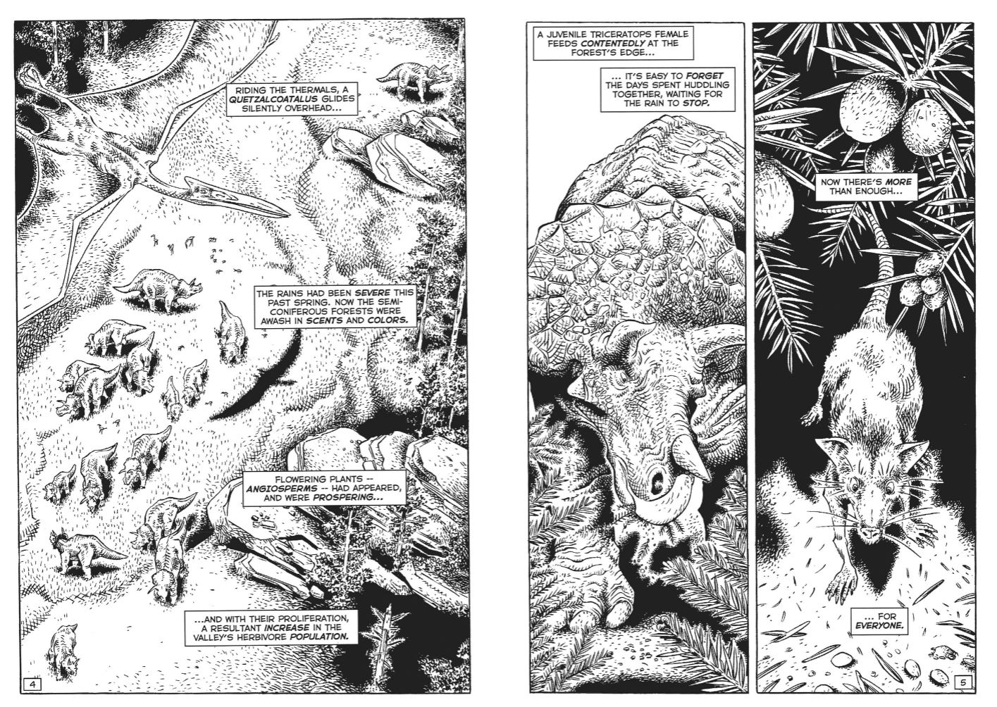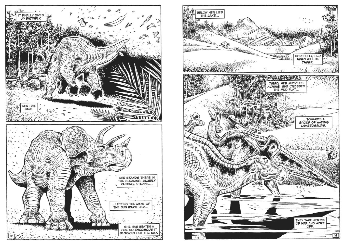 This mammoth man-free collection begins with that aforementioned Introduction before quickly thundering on to the meat we all crave, opening with Book One (inked & lettered by Laird) focusing attention on a key moment in the life of a Triceratops 70 million years from now, but in the other direction…