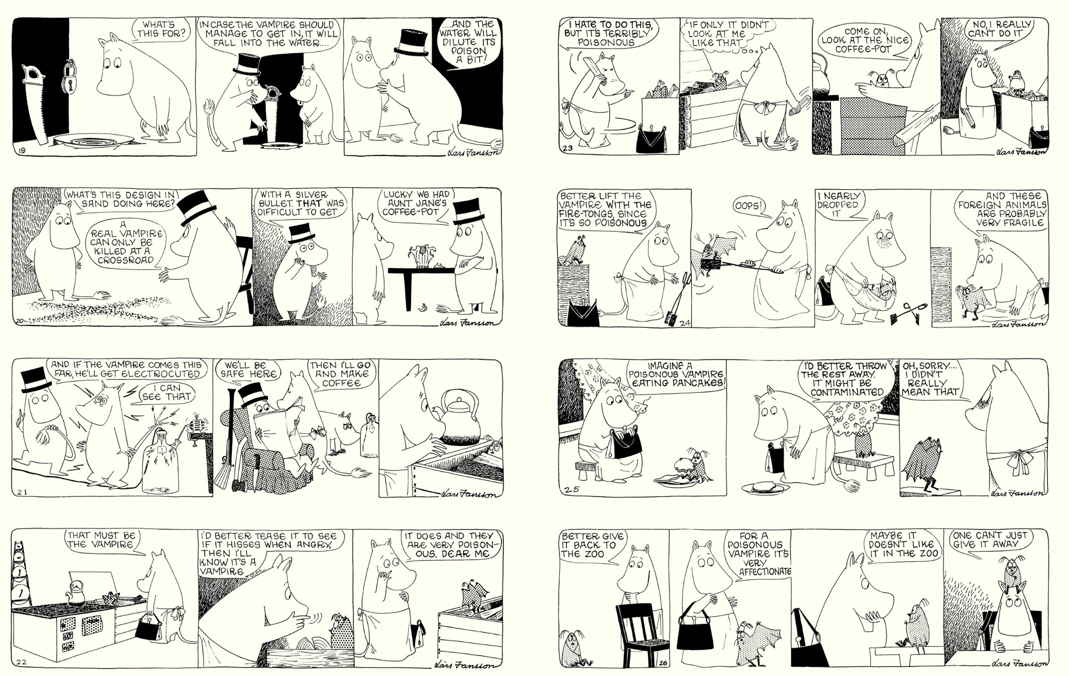 A wonderfully whimsy driven affair, this 10th and final monochrome moon melange delivers serial strip sagas #38 to 41, and commences with Lars still totally in charge as panic grips the sheltered valley-dwelling community. This is thanks to something supernally sinister and quite unknown pops by for the mass mess deemed ‘Moomin and the Vampire’…