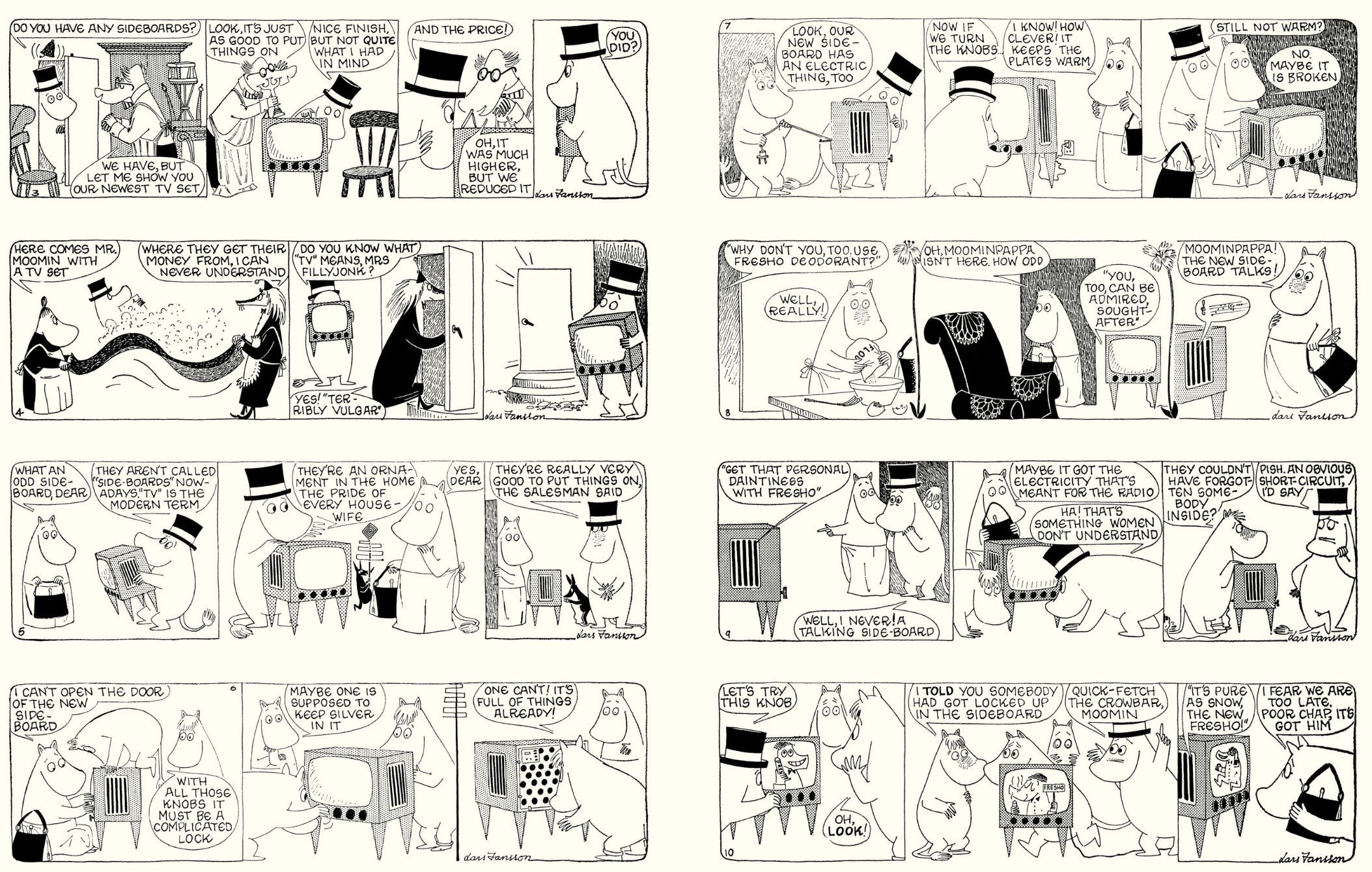 Up next and a swingeing assault on popular cultures comes ‘Moomin and the TV’, as the reclusive Moomins go shopping for anew sideboard and are pressured into purchasing a top of the line television set…