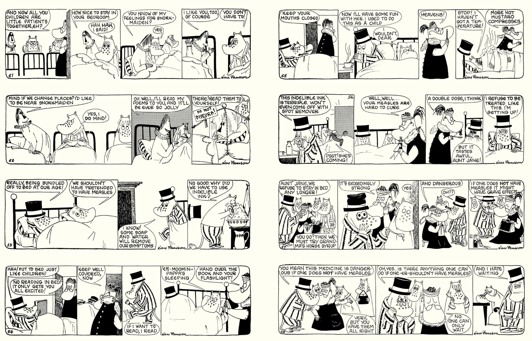 The wonderment comes to a close with a whiff of prognostication and prophecy as winter draws on in ‘Moomin and Aunt Jane’. When glamourous but generally useless Romantic poet Wispy moves in next door, he accidentally and then intentionally beguiles flirtatious dreamer Snorkmaiden, just as a little old lady haunts the chilly community. Perpetually predicting frozen doom and deadly privation, she starts to snaffle any potentially useful kit – other people’s blankets, firewood, food, skis, stores. As young Moomin and the maiden again perform their standard jealousy dance, ‘Pappa finally listens to the busy biddy and is convinced the extremely cold end of days is coming. As he begins his own excessive doomsday-prepper precautions, Wispy and Snorkmaiden elope with Moomin in cold pursuit, and the crisis goes into overdrive as prim, officious Moomin Aunt Jane invites herself to stay. Not even faking deadly illness can deter this dowager do-gooding know-it-all and she has no time for silly biddies, puling poets, vacuous romance or any sort of nonsense..