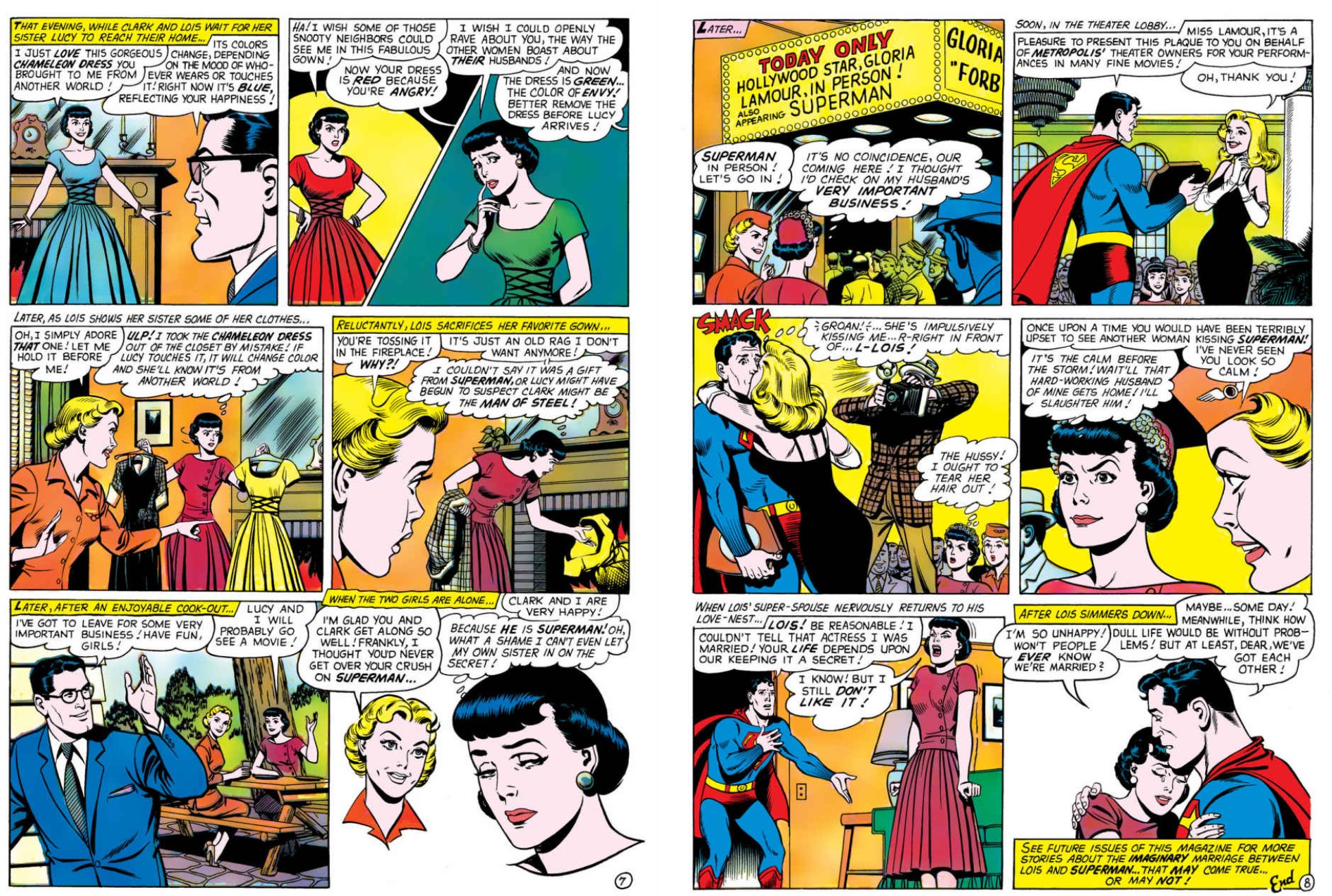 ‘The Second Life of Batman’ (Bill Finger, Dick Sprang & Charles Paris in Batman #127, October 1959) doesn’t really fit the strict definition either, but the tale of a device that predicts how Bruce Wayne’s life would have run if his parents had not been killed is superb and engaging all the same. In contrast, ‘Mr. and Mrs. Clark (Superman) Kent!’ (Jerry Siegel & brilliant Kurt Schaffenberger) was the first of an occasional series that began in Superman’s Girlfriend Lois Lane #19 (August 1960). Far more apropos, it depicts the laughter and tears that might result if the plucky news-hen secretly marries the Man of Steel.