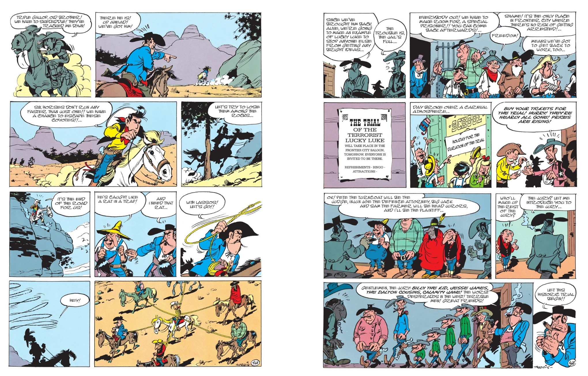 Graced with biographies of Morris and Goscinny and peppered with contemporaneous extras this is perfect for kids with a smidgen of historical perspective and social understanding, although the action and slapstick situations are no more contentious than any Laurel and Hardy film – perfectly understandable as Morris was a huge fan of the duo. These formative forays are a grand old hoot in the tradition of Destry Rides Again or Support Your Local Sheriff, superbly executed by master storytellers, and a wonderful introduction to a unique genre for anyone who might well have missed the romantic allure of the Wild West that never was…