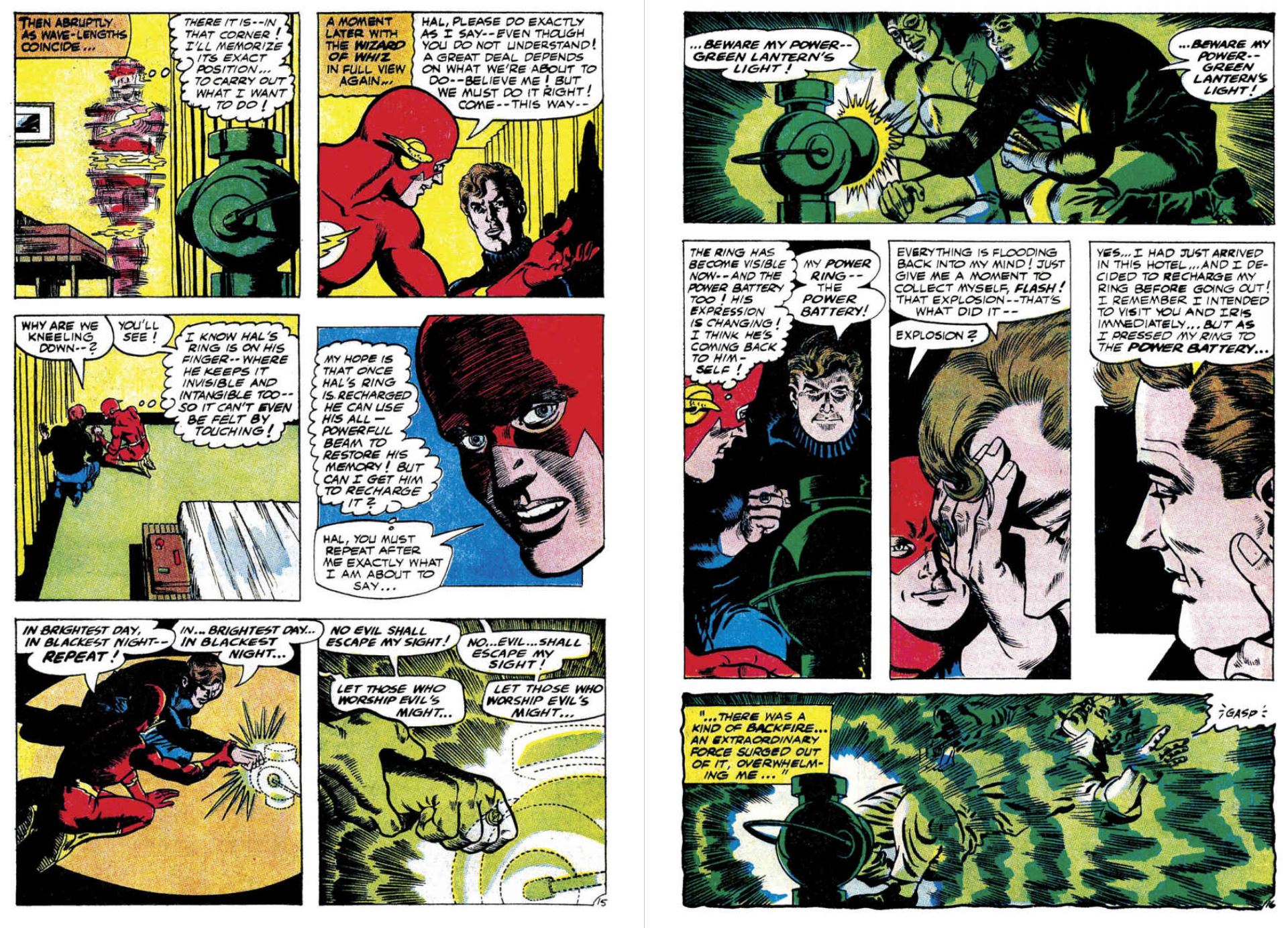 We end as we began for the last tale in this collection, wherein Mike Friedrich pens ‘Thoroughly Modern Mayhem!’ Mercifully the story is as wonderful as the title is not, since it cut to the quick of a problem many a kid had posited. If the power ring was so powerful why not just command it to end all evil? When the old and world-weary Emerald Crusader of Earth-2 does just that, it takes both him and his Earth-1 counterpart to remedy the shocking consequences to all of humanity…