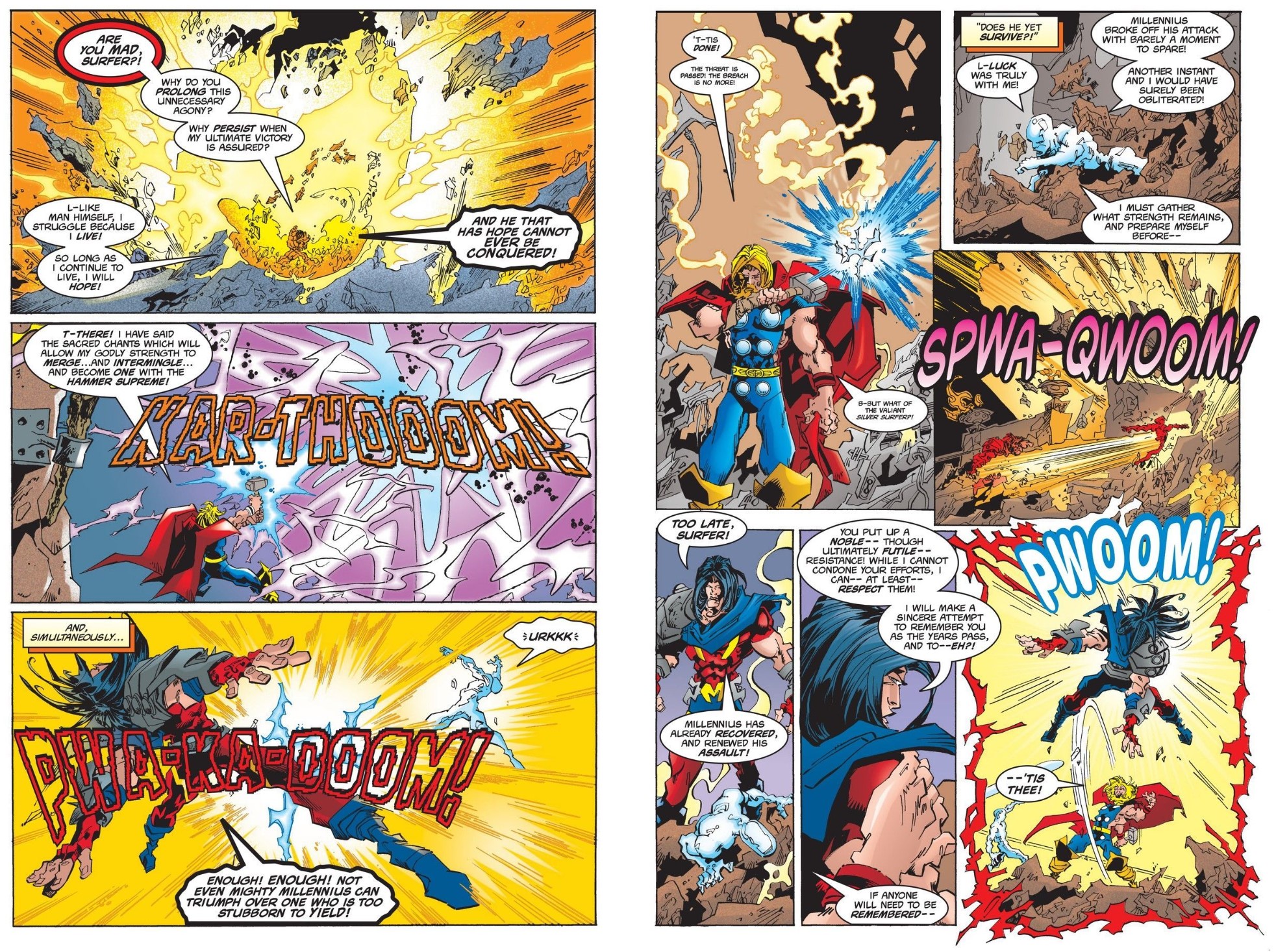 Next comes a notional prequel tale from Silver Surfer & Thor Annual 1998, courtesy of Tom DeFalco, Ramon Bernado & Mark Pennington. ‘Millennius!’ finds the Silver Surfer beset by frost giants that have somehow escaped the confines of Asgard. After thrashing and returning them whence they belong, investigation beside the stormy Prince uncovers a plot by an exiled vengeful if not utterly deranged primal god determined to wreak havoc upon the modern universe and resume reshaping what remains to his dark whims. Thanks to the valour of the heroes he does not succeed…