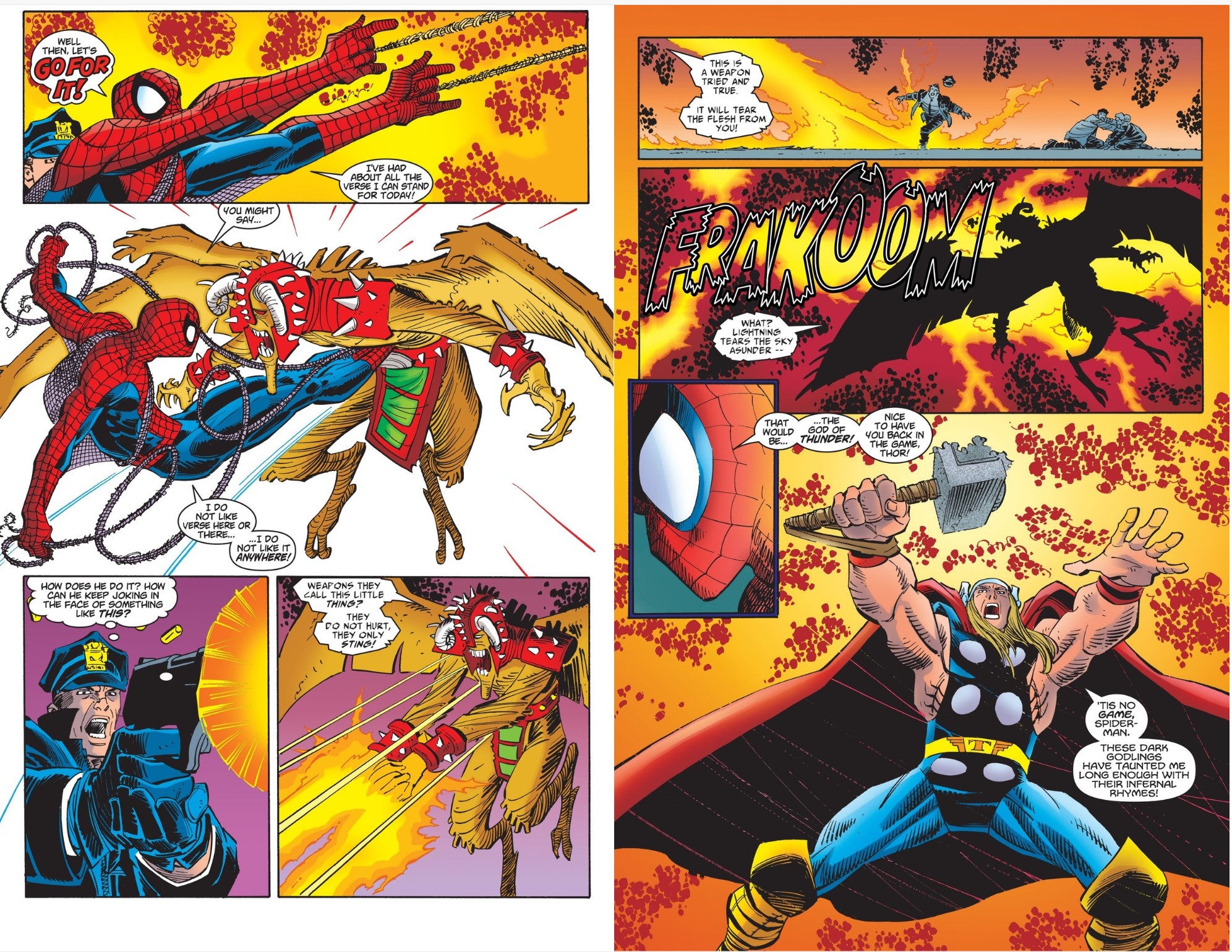 Back at now, a stellar crossover between hammer-hurler and webspinner opens in Thor #8 as the Thunder God encounters the astounding arachnid as Tokkots goes on an Earthly rampage in ‘…and the Home of the Brave!’ prior to being spectacularly defeated and despatched to enslaved Asgard in ‘Plaything of the Gods’ (as seen in Peter Parker, Spider-Man #2, by Howard Mackie, Romita Jr. & Scott Hanna).