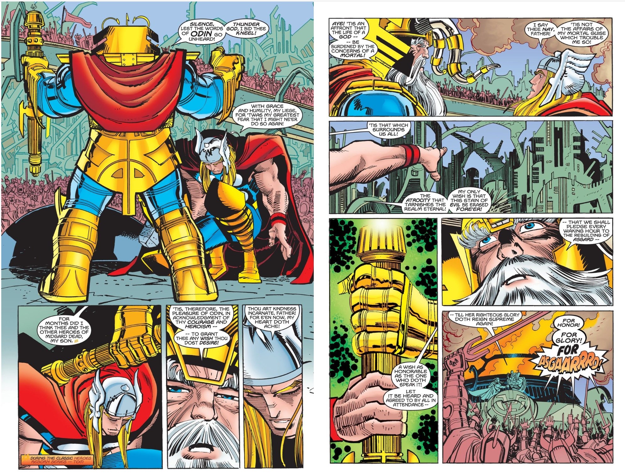 Time passed, Kirby left and the Thunderer’s fortunes waxed and waned. During the troubled mid-1990’s the title vanished, culled with The Avengers, Iron Man, Captain America and Fantastic Four and subcontracted out to Image creators Jim Lee & Rob Liefeld during 1996-1997 in a desperate attempt to improve sales after Marvel’s apocalyptic Onslaught event.