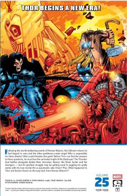 In 1998 Heroes Return and Heroes Reborn saw those properties rejoin the greater Marvel Universe, relaunched with new first issues. The Thunder God reappeared a few weeks later as in July, Mighty Thor volume 2 launched. This compendium gathers # Mighty Thor #1-13, plus Silver Surfer & Thor Annual 1998; Thor Annual ’99 & Peter Parker, Spider-Man #2 spanning July 1998 to July 1999.
