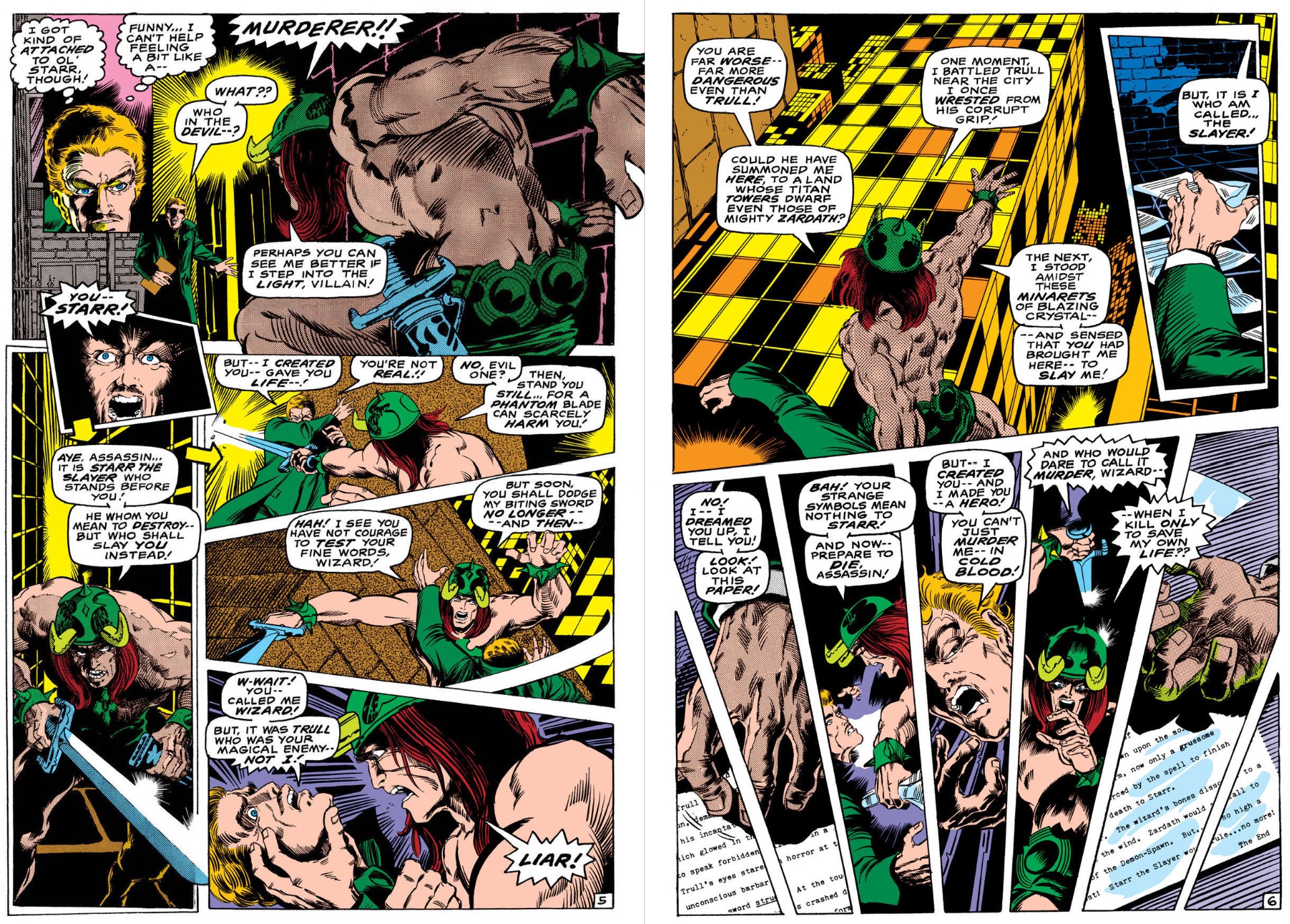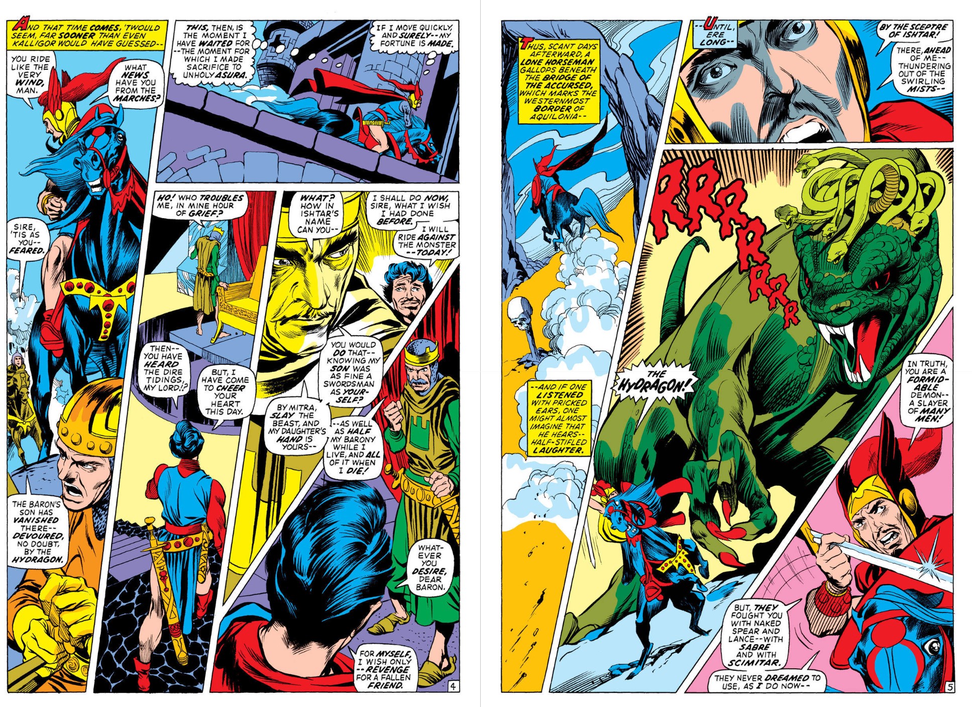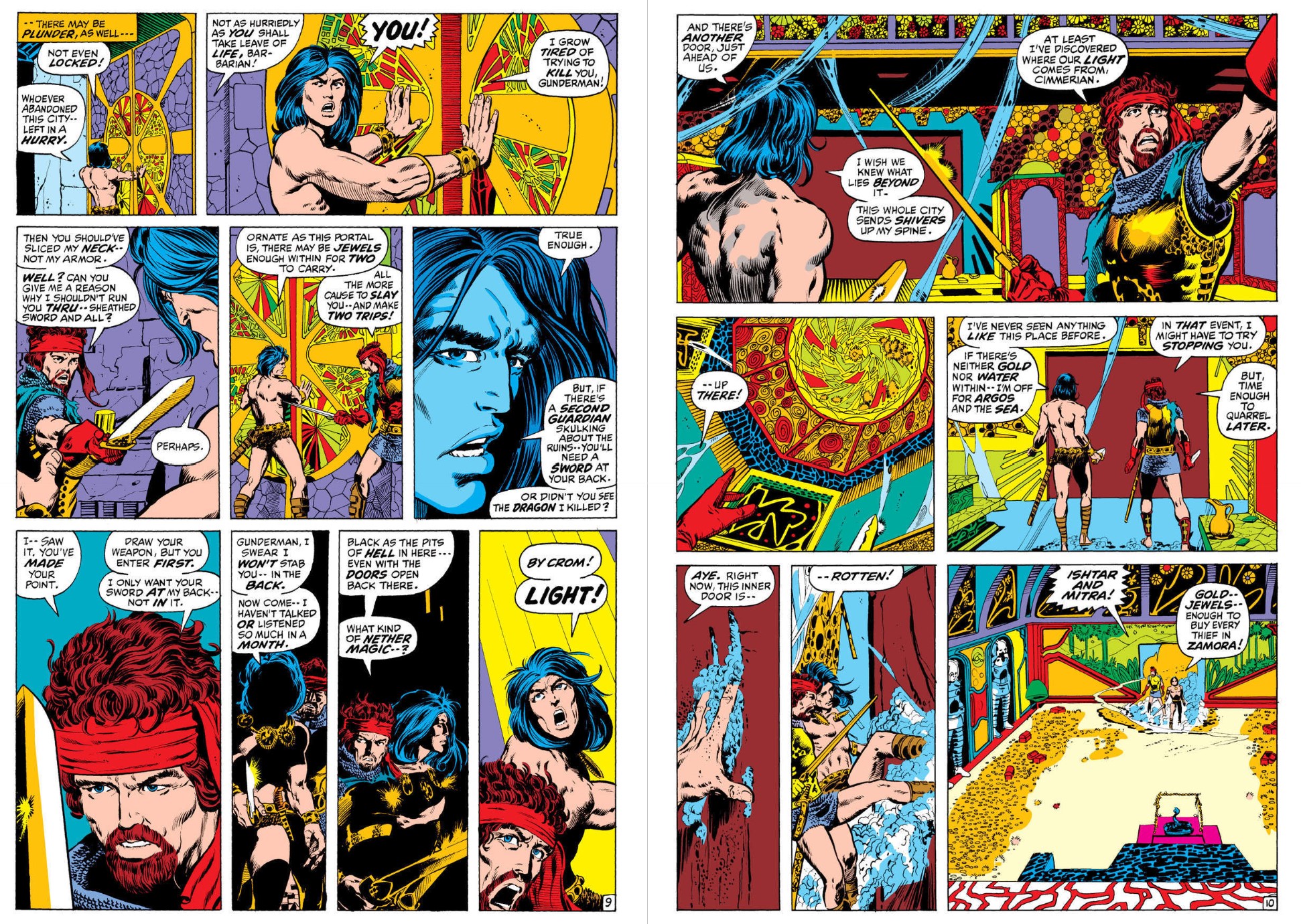 ‘Dweller in the Dark’ is an all-original yarn of monsters and maidens, notable because artist Smith inked his own pencils, and indications of his detailed fine-line illustrative style can be seen for the first time. An added bonus in that issue was a short back-up yarn by Thomas & Gil Kane with “Diverse Hands” called in to ink ‘The Blood of the Dragon!’: telling of a very different Hyborian hero getting what he deserves…