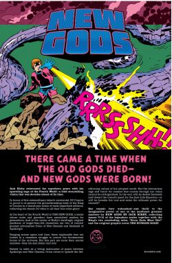 We learned that (relatively) soon after creation began gods were born, lived and died – primarily by warring with each other. When the Old Gods died in a cosmos-shaking conflagration their perfect primal world was sundered. When the chaos cooled the fragments had congealed into two new but lesser planets: the dark vicious globe of Apokolips and gleaming noble orb New Genesis. Over millennia another generation of superior beings of might and majesty populated the spinning spheres, but sadly, a tragic trait New Gods shared with their progenitors was a capacity for destruction and taste for conflict. Denizens of both worlds always and inevitably find new ways to end each other’s immortal lives.