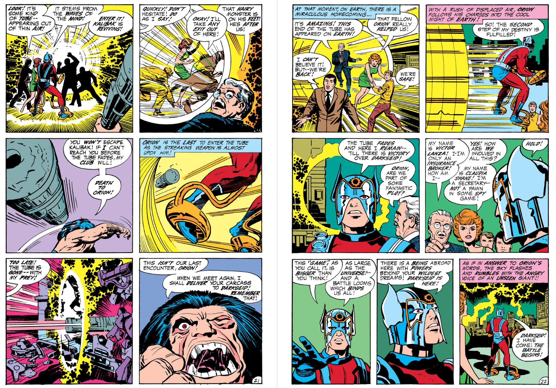 After batting his way into the world, against Parademons, Darkseid’s Dog Cavalry and assorted terror weapons, Orion frees the mortals before New Genesis God of Knowledge Metron delivers advice and a message. Thus after outwitting and outfighting vile brute Kalibak the Cruel the peaceful God of War uses a matter-transmitting Boom Tube to return them all to Earth…