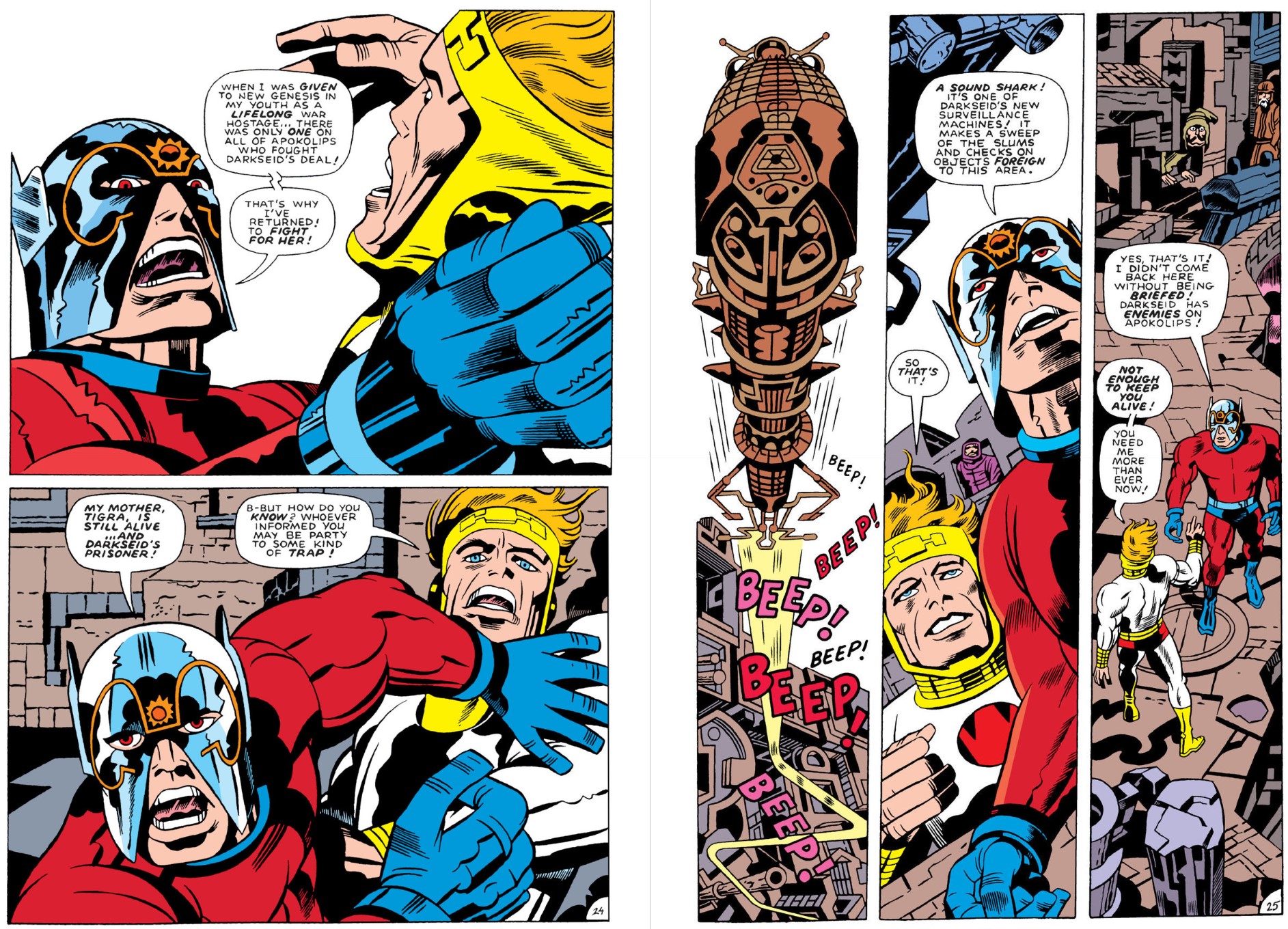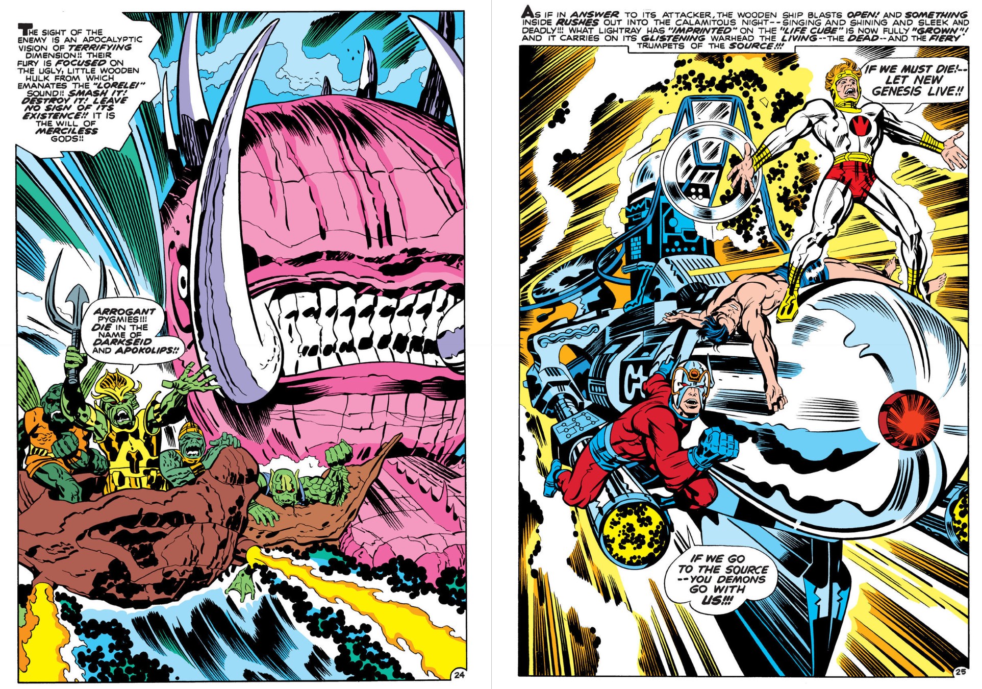 The tale proper begins on joyous, spiritual New Genesis years after the latest all-out war with Apokolips ceased. Mighty Orion arrives in paradisical Supertown where divine patriarch Highfather communes with cosmic mystery The Source. The metaphysical conduit despatches the turbulent, ever-anxious wolf in their fold to the antithetical diabolical hell-world, only to find despot Darkseid gone and – against all treaties – captive humans from Earth being “examined” for signs of the tyrant’s dream. For both races the basic tool is Mother Box: sentient circuitry connected to The Source and a lifelong cyber-symbiotic companion, able to communicate, advise and manipulate the physical world.