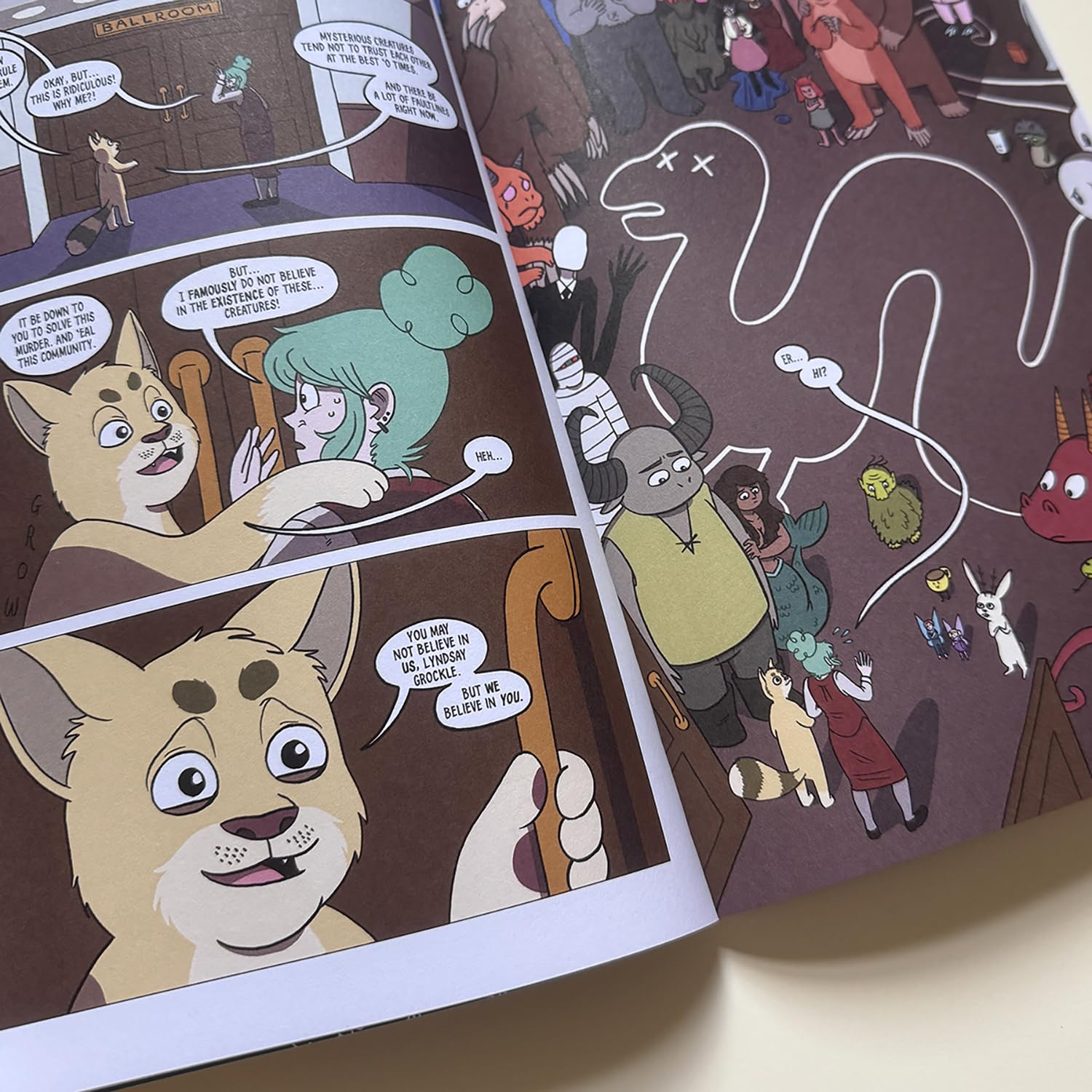 Prepped but nervous, the hordes arrive (57 guests actually!) and settle in. As she was warned Lindsay learns they take their role-playing really seriously. At least it’s all familiar stuff – monsters, cryptids, fairies, legendary beasts and the like – giving Grockle time to stew in what went wrong in her recent bust-up and ponder what life’s all about…