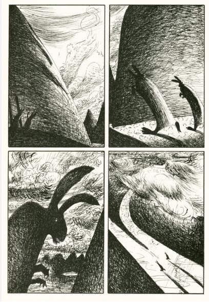 Behind a deeply unsettling gate-fold wraparound cover, but printed throughout on reassuringly solid cream-coloured card-stock, lurks a startling journey from idyllic cloud-gazing through vaguely erotic musings on gods and giants to the depths of a terrifying and oppressive forested hell. Rendered in bravura line-and-dry-brush style that ranges from seductive and cajoling, through airy tumult to raw, fierce, bestial rage and horror, Mattotti uses the reader’s eyes to pull the viewer on a chaotic descent reminiscent of Mussorgsky’s “A Night on Bald Mountain” (in the manner of Disney’s Fantasia version, with just a shade of Watership Down thrown in).