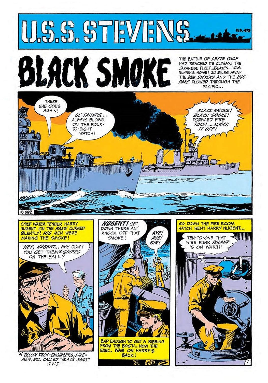 U.S.S. Stevens, DD479 was a peripatetic filler-feature bobbing about between Our Army at War, Our Fighting Forces, G.I. Combat, Star Spangled War Stories and the other anthological battle books; quietly backing-up the cover-hogging, star-attraction glory-boys. It provided wry, witty, shocking, informative and immensely human vignettes of shipboard life, starring the fictionalised crew of the destroyer Glanzman had served on. It was, in most ways, a love story and tribute to the vessel which had been their only home and refuge under fire. In 4- or 5-page episodes, the auteur recaptured and shared a kind of comradeship we peace-timers can only imagine and, despite the pulse-pounding drama of the lead features, us fans all knew these little snippets were what really happened when the Boys went “over there”. Just like now…