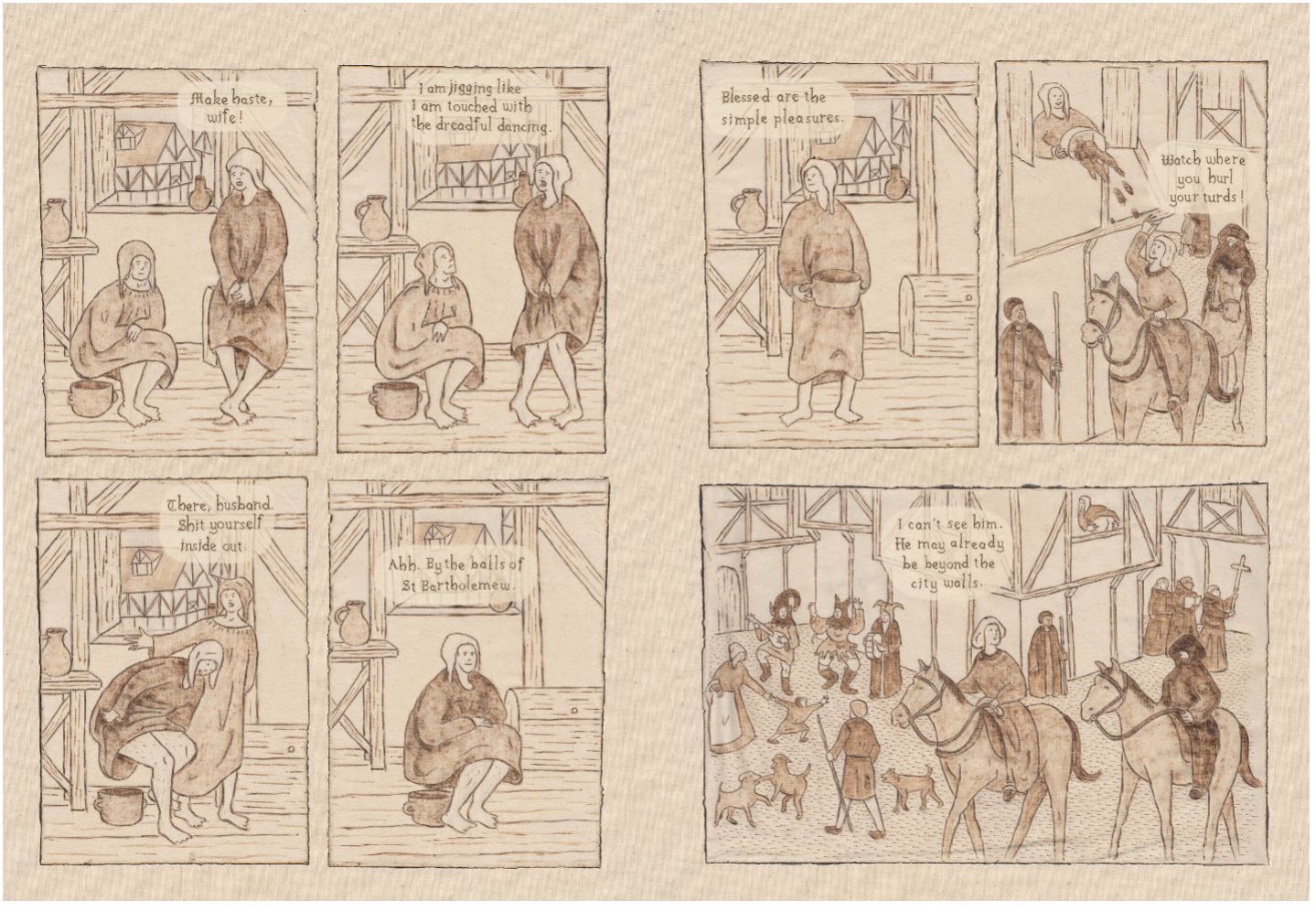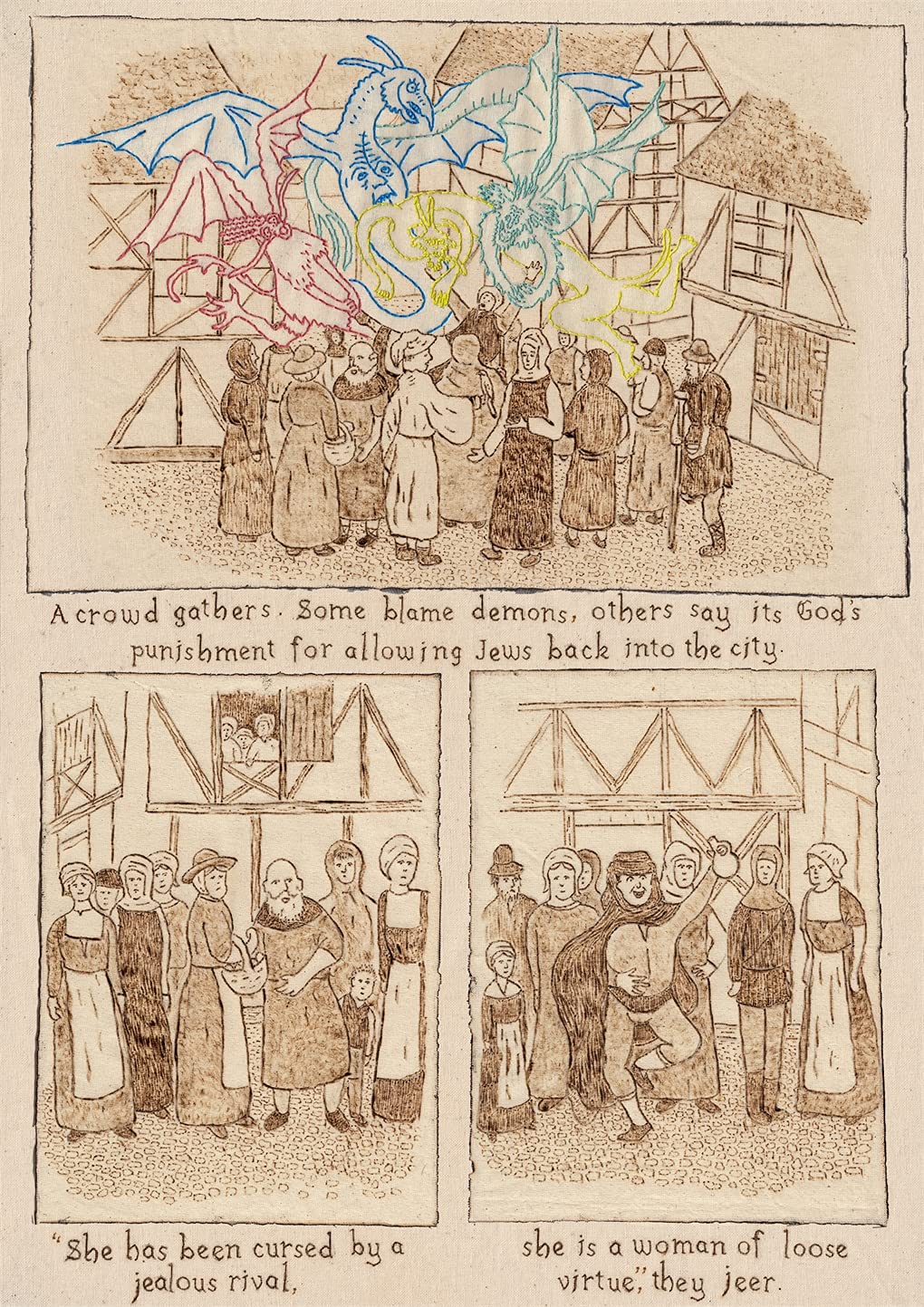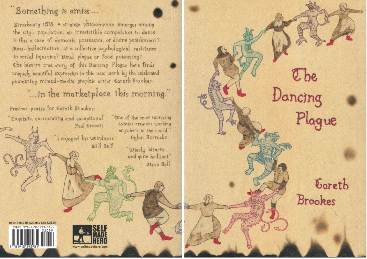 Deeply unsettling, earthily, gloriously vulgar in the manner of the Boccaccio’s Decameron or proper, unexpurgated Chaucer; outrageously witty and slyly admonitory, The Dancing Plague is rendered with (I’m assuming positively therapeutic) mastery in invitingly multicoloured, multi-layered linework reminiscent of woodblock prints, generated by “pyrographic” (inscribed with heated drawing tools) and painstakingly-sewn embroidery. As I’ve said in previous reviews, it’s like nothing you’ve ever seen and serves to form an equally unique narrative.