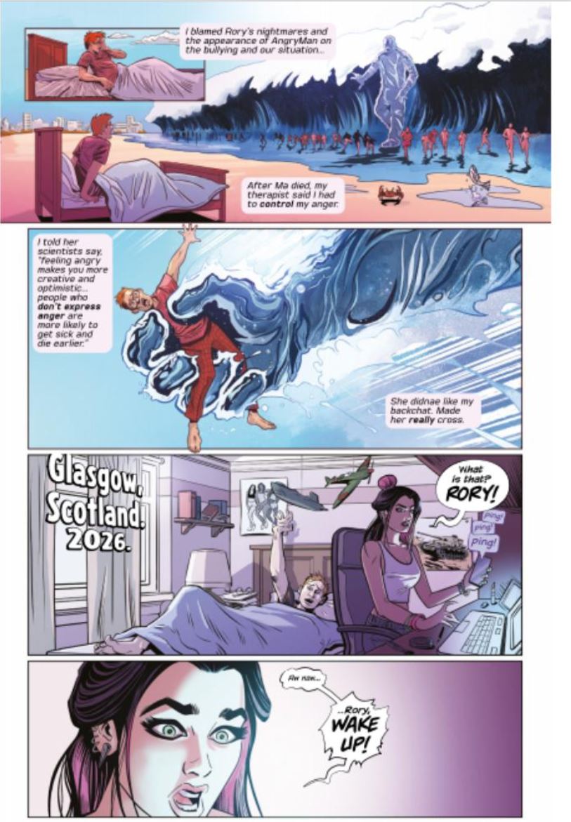 At this moment of now in opening chapter ‘Fully Munted’, it’s 2026 in Glasgow and cleaner/presumed orphan Jade Nyo is hoping to forget the shitty world, crap prospects of survival and especially younger brother Rory’s persistent tortured nightmares of tsunamis and global collapse, as personified in recurring images of a big angry sod he calls “AngryMan” leading the inundations.