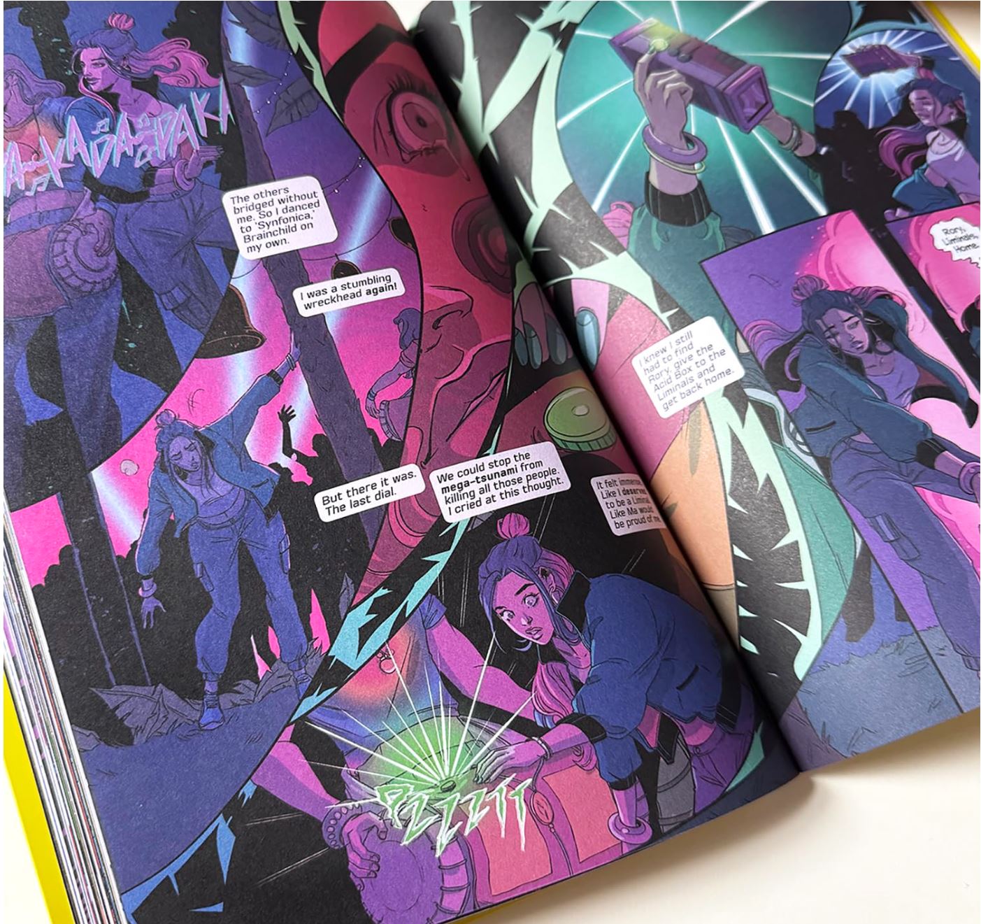 Packed with and augmented by utterly absorbing sidebar bonus material, this is a sublimely absorbing romp embroidered with true love of the period and source music material that will no doubt make a fabulous and funny film one day. The primary creators are led by Sarah Kenney (Surgeon X, She Could Fly, Planet Divoc-91) who writes socially informed speculative fiction (the other, accurate, term for Science Fiction) and works as a scripter, producer and director for the Games industry and television. Her visual collaborator on Surgeon X and Planet Divoc-91 is Glasgow-based James Devlin (Tomorrow, LaGuardia) who here joins multidisciplinary performance artist Emma Vieceli (Life is Strange, BREAKS) and illustrator Ria Grix (The Anomalous Adventures of Viola Holm and Kotiin).