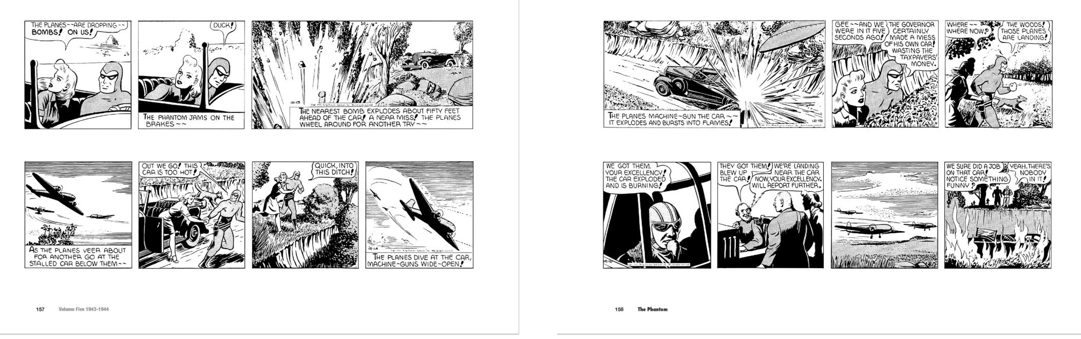 The vintage blood-&-thunder fun begins with brooding, tension-packed thriller ‘Bent Beak Broder’ (originally running Mondays to Saturdays, January 11th to May 22nd 1943) wherein Phantom – and faithful wonder-wolf companion Devil – duck the escorts and parades to head for Diana’s home and sickbed. It involves a tedious cross country hitchhiking stint and lands the hero-in-mufti in the middle of a prison break. When ruthless rogue Bent Beak kidnaps a young girl and goes on a rampage, our seasoned crimebuster is duty-bound to postpone his romantic reunion and hunt down the monstrous malcontents in a stunning display of psychological warfare and thundering fists, leaving the convicts mentally scarred for life and marked with the Phantom’s signature Death’s Head ring brand…