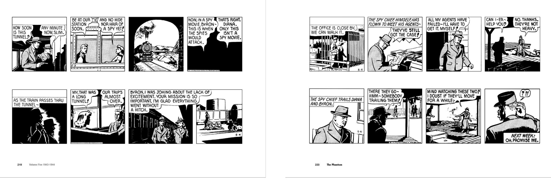 Saddened by his loss, The Ghost Who Walks decides on one last (secret) glimpse of Diana before losing himself in the Jungles of Bengali and returns to America just in time to become embroiled in ‘The Spy Game’ (28th February – 20th May). Byron and Diana are “Just good friends” now, and when the Captain is ordered by Uncle Dave (a big deal in US Military Intelligence) to courier a briefcase of secrets to a specific location at a certain time, Diana adds cover as his wife. Unfortunately the couple are under surveillance already, by a deadly ring of spies: a certain masked hero and his wolf who get the wrong idea. When Kit Walker notices their other shadows, he gets involved behind the scenes, safeguarding them on a spectacular and mindbending Hitchcock-like odyssey of peril and intrigue involving planes, trains and automobiles, and non-stop action, that ends with The Phantom and Diana reunited and engaged again. However Byron, already despatched on another mission, has extracted a promise that she will marry no one else until his return…