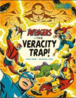 That primordial period of Kirby-limned luminal ideas and escalating inspirational influences is a mini halcyon era: one potently, evocatively addressed and revered in this very special project from two iconic modern award-winners and devout comics lovers. With their “Veracity Trap” designer/author/historian Chip Kidd (Batman: Death by Design, Jack Cole and Plastic Man, The Cheese Monkeys) and designer/author/illustrator Michael Cho (Papercut, Shoplifter, hundreds of DC and Marvel covers) cheerfully knock down all the fourth walls and puckishly inject themselves into the medium and their message to deliver a compelling pastiche of all that too-brief Kirby-spawned early Avengers wonderment.
