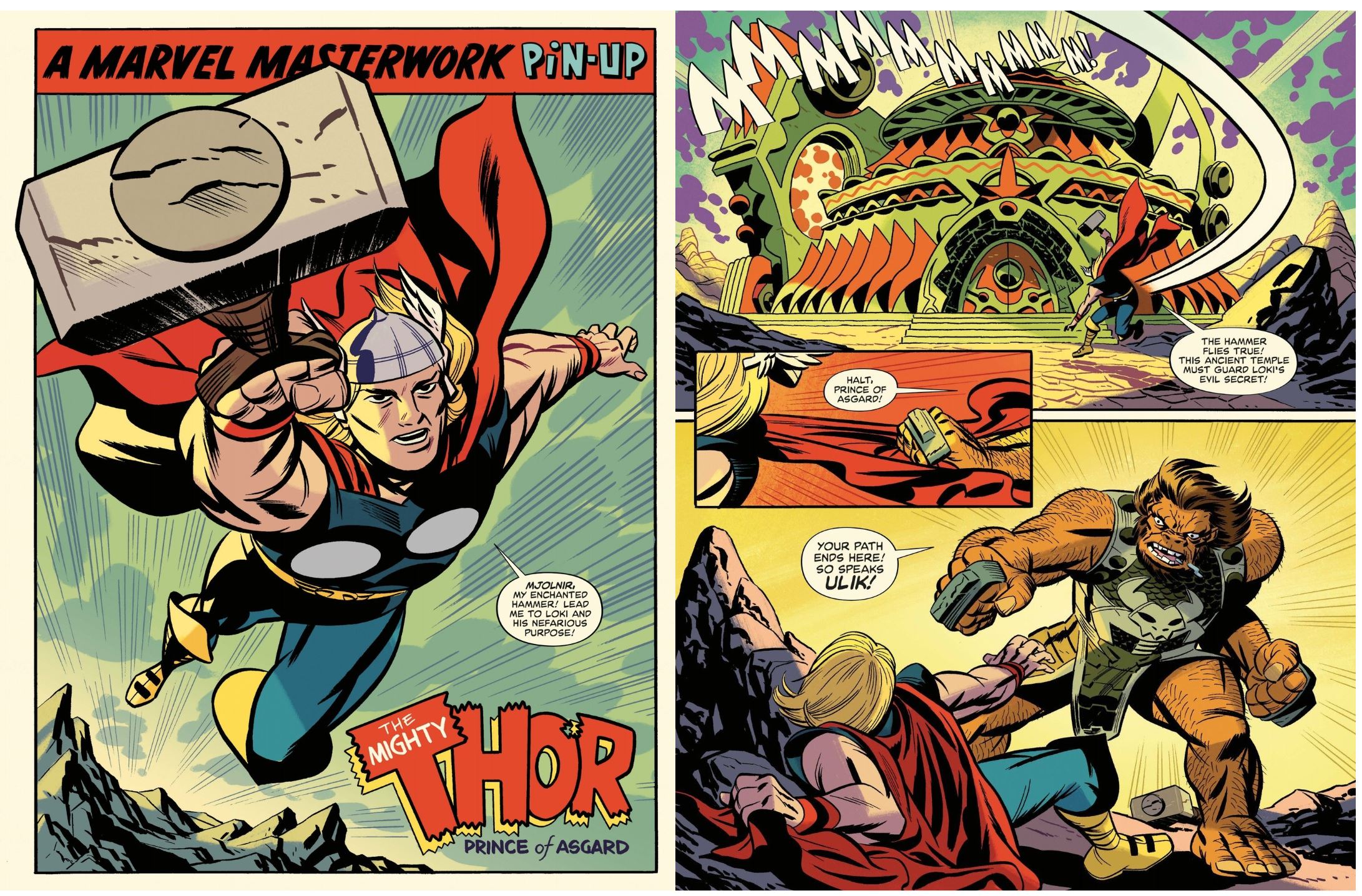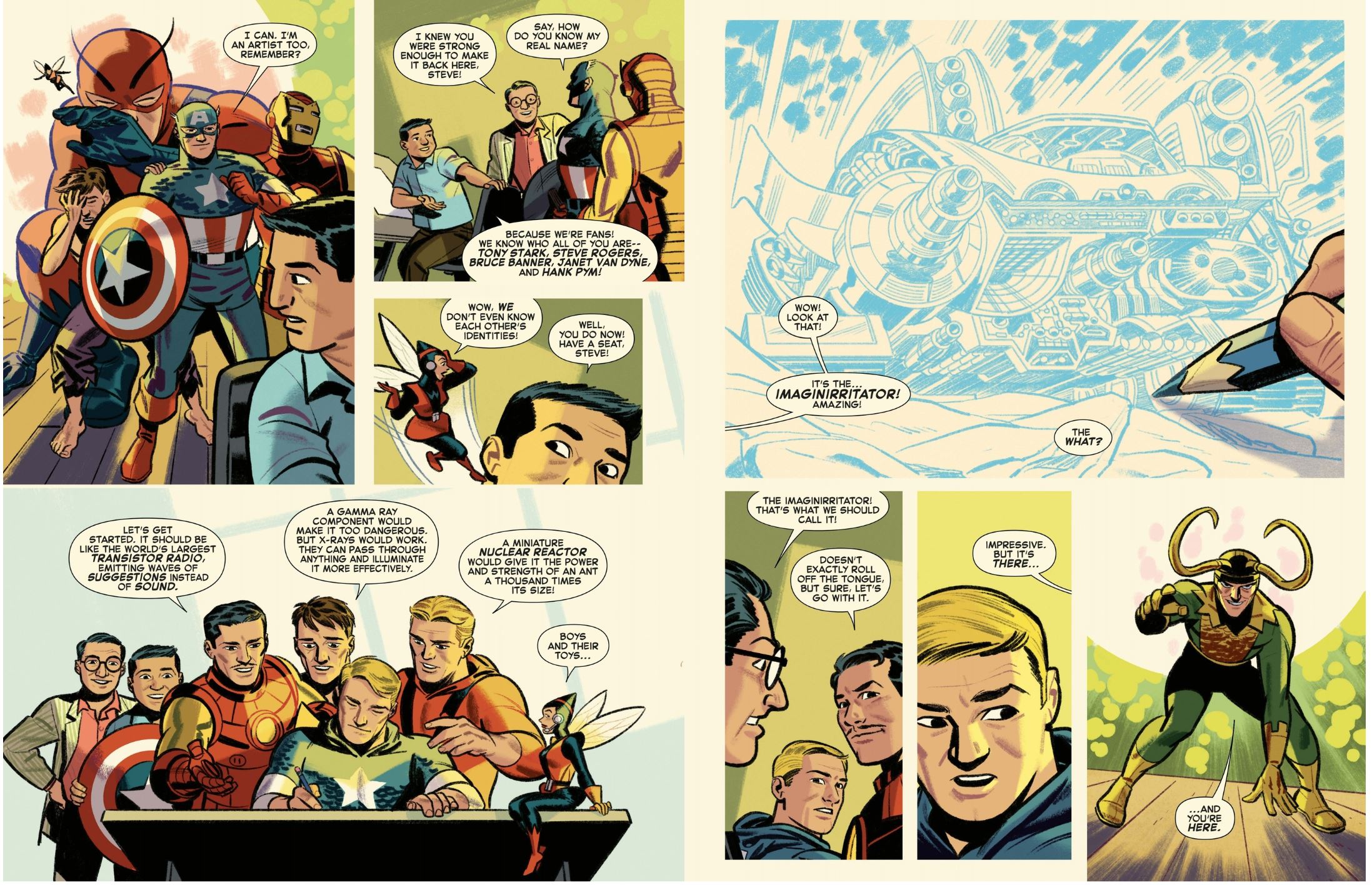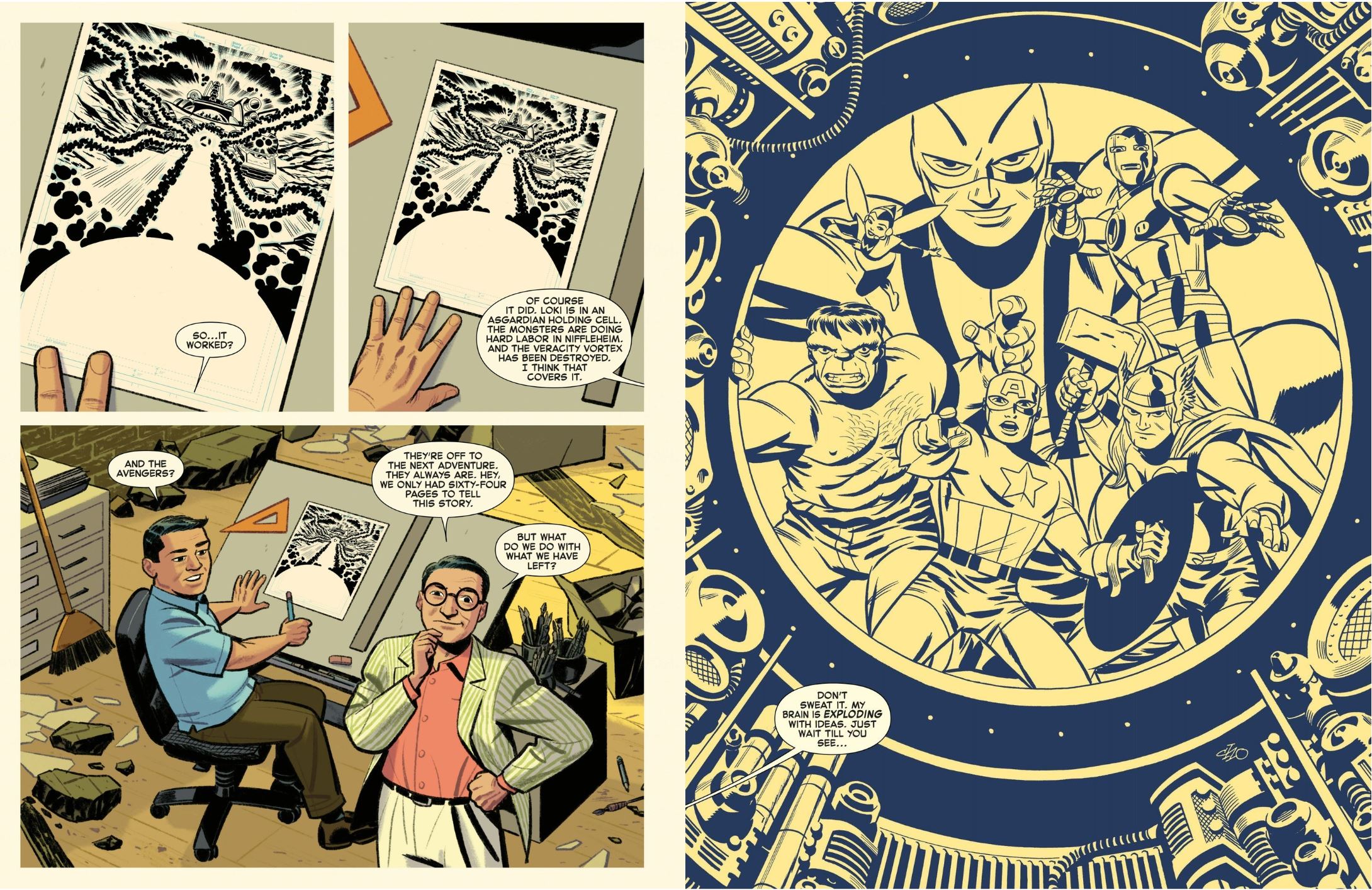 Suitably packed with stirring tribute moments from eye-bending wonder-machines to stellar landscapes, and packed to the scaly oversized gills with charmingly monstrous “Kirby-Kritters” aiding and abetting the heroes and villains, this rocket-paced epic sees a team that never quite was – Thor, Iron Man, Giant-Man, The Wasp, Captain America and The Hulk – unite to battle Loki once more, only to be booby-trapped and portentously propelled beyond their home universe into a Greater (albeit still Four-Colour) Reality where godlike cartoonists and pen-pushers casually dictate their fates… until the malevolently malign God of Mischief usurps their elevated position and endangers all layers of existence!