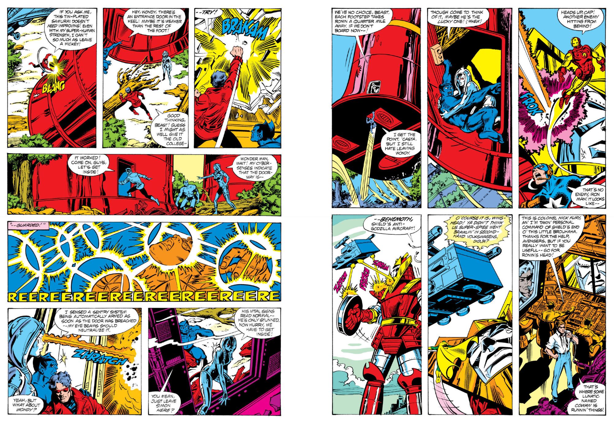 Cold War paranoia fuels Avengers #197’s ‘Prelude to the War-Devil!’ (illustrated by Carmine Infantino, Abel and a horde of helpers) wherein overwrought scientist Dr. Cowan absconds from Stark Detroit facilities inside a super-mecha warrior initially built to destroy the undisputed king of Kaiju (see Godzilla: The Original Marvel Years). Unable to stand the tension any longer, the boffin intends triggering WWIII and ending the anxiety of humankind once and for all, but must first face the deployed and increasingly desperate Avengers in ‘Better Red Than Ronin!’ (art by Pérez, Brett Breeding & Gene Day) and cataclysmic climax ‘Last Stand on Long Island’ (inked by Dan Green).
