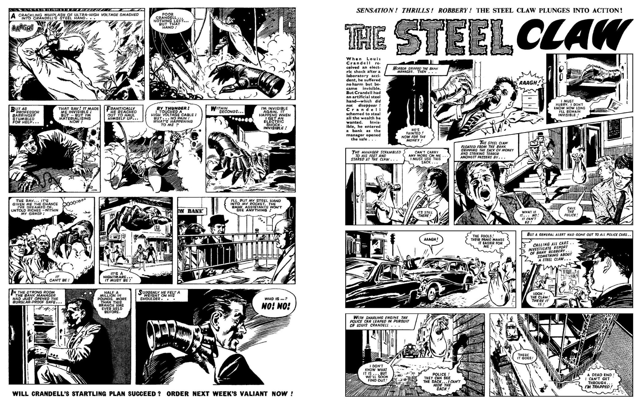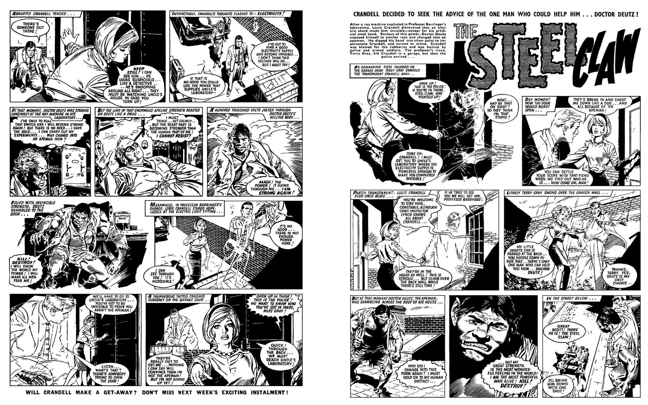 One of the most fondly-remembered British strips of all time is the startlingly beautiful Steel Claw. From 1962 to 1973 the stunningly gifted Jesús Blasco and his small studio of family members thrilled the nation’s children, illustrating the angst-filled adventures of scientist, adventurer, secret agent and even – occasionally – costumed superhero Louis Crandell.