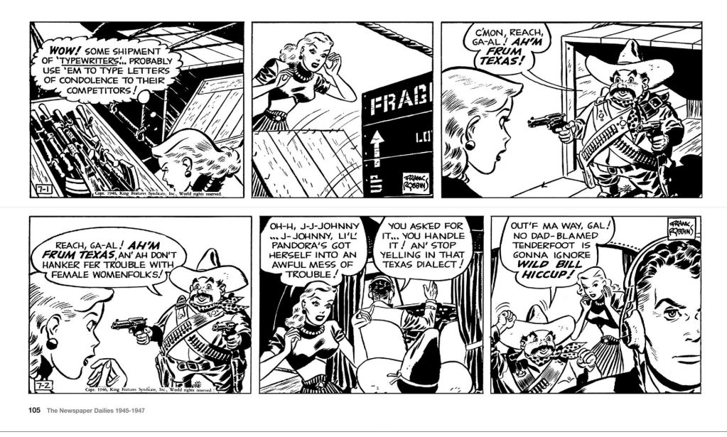 Sharp, snappy and devilishly funny repartee in the style of movies like Howard Hawks’ His Girl Friday and Frank Capra’s It Happened One Night are a hallmark of these rapid fire yarns, some of the greatest comic strips in history, but that can present a few problems for modern readers. Contemporary attitudes to sexuality, gender and particularly race are far from what we find acceptable – or should even tolerate – today. We know better now – at least most of us do – but must accept and understand that hurtful and unjust as such terms are, they did exist and we’re doing history and our society a hugely dangerous disservice by ignoring, downplaying or worst of all self-censoring those terms and the attitudes that fed them.