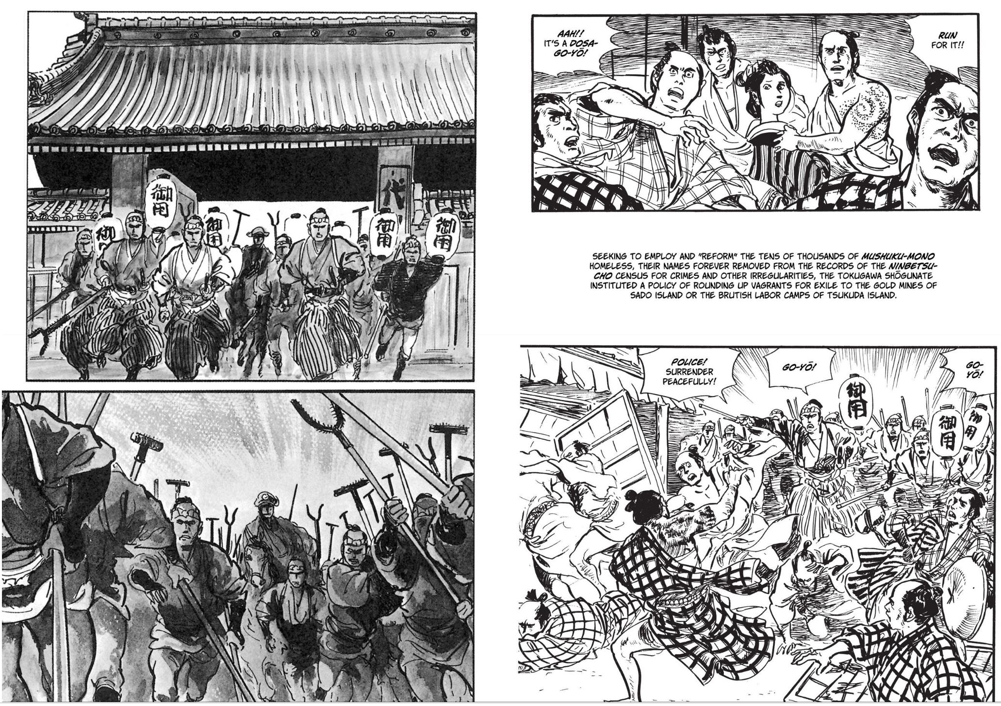 Using intermediaries and regional civil servants Retsudō has devised a way to remove the thorn in his side without blemishing the sacrosanct Ura-Yagyū reputation. Arranging for his nemesis to be rounded up in a homeless sweep, the wolf is but one amongst hundreds bundled along by law officers, and must surely die or be condemned as a mining slave. Sadly, the plotters underestimate Ōgami’s cunning, knowledge of the law, suspicion of bureaucrats sheer lethality with bladed weapons and tricked-out, gunpowder-laden baby carriage…