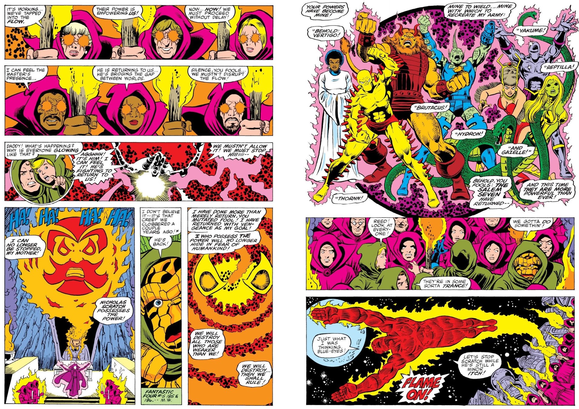 The revived, excessively rejuvenated team are in full fine fettle for Fantastic Four Annual #14 wherin Marv Wolfman, George Pérez & Pablo Marcos put firstborn Franklin Richards and his sorcerous nanny Agatha Harkness in the spotlight for ‘Cats-Paw!’ When magical cult Salem’s Seven abduct and brainwash the adult FF in hopes of resurrecting their macabre master Nicholas Scratch, even the Avengers are helpless to stop the carnage unleashed. Thankfully, the extra-dimensional voyage of the kid and the crone is enough to set everything right…