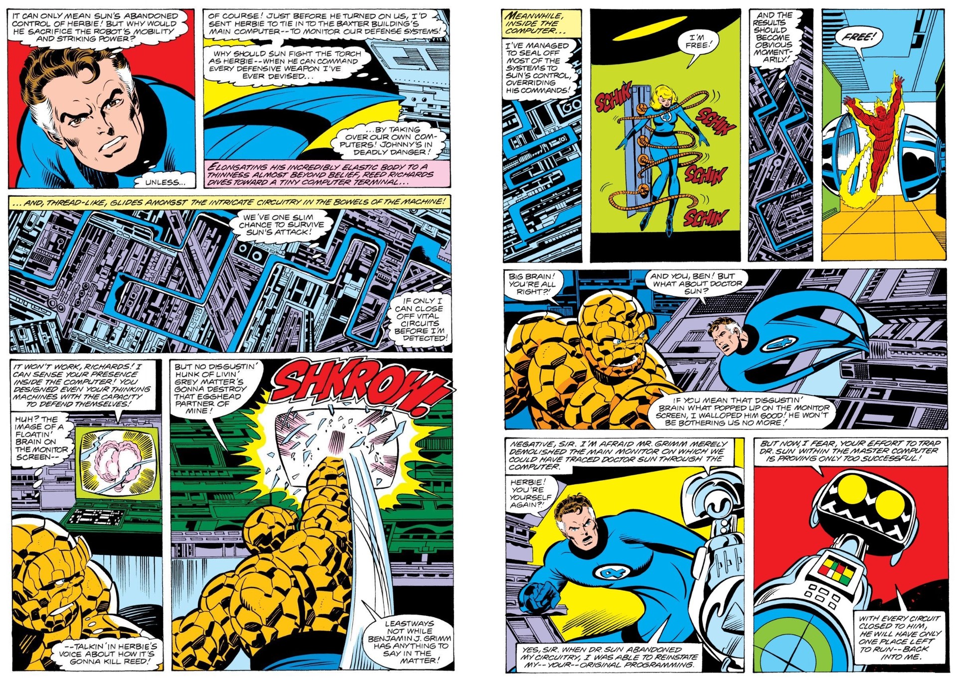 Infernal gadget H.E.R.B.I.E. was imposed on the series due to concerns by producers of the current Fantasic Four cartoon show. Rejecting fire hazard Johnny for a cutely telegenic robot, Wolfman cheekily made that commercial compromise in-world canon, dividing fans forever after. The bleeping bot – a Humanoid Experimental Robot, B-type, Integrated Electronics (latterly, Highly Engineered Robot Built for Interdimensional Exploration; don’cha just love nominative deterministic acronymics?) – is pure Marmite in most readers eyes…