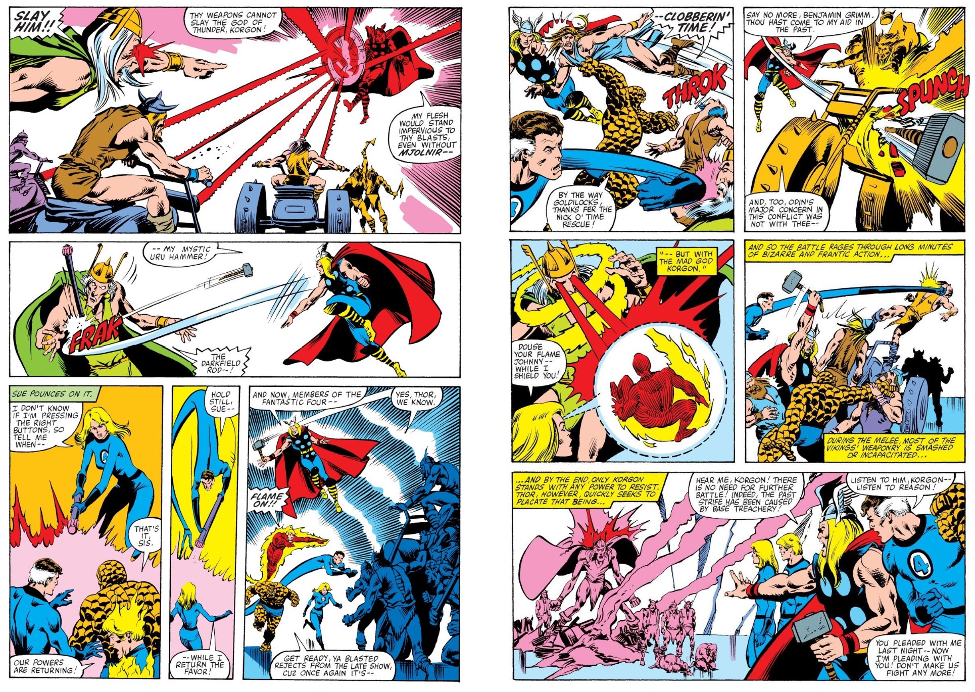 Over in FF #224 & 225, fresh calamity unfolds in ‘The Darkfield Illumination’ (Moench, Sienkiewicz & Pablo Marcos) as radioactive red mist blankets Manhattan and plays hob with the team’s powers. Tracing the cloud’s origin point to an icy dome in the Arctic, the FF find a lost colony of technologically advanced Vikings utterly dependent upon a mutated immortal giant. ‘The Blind God’s Tears’ supply heat, light, food materials from the outside world and immortality, but now Korgon is dying and demands the explorers save him and the people who worship him. Always eager to help, the FF strive and succeed in saving the God, only to see him betrayed by his most trusted ally. As Korgon rages madly in response, the crisis escalates as Mighty Thor arrives to investigate worshippers who have abandoned their true god for a false one…