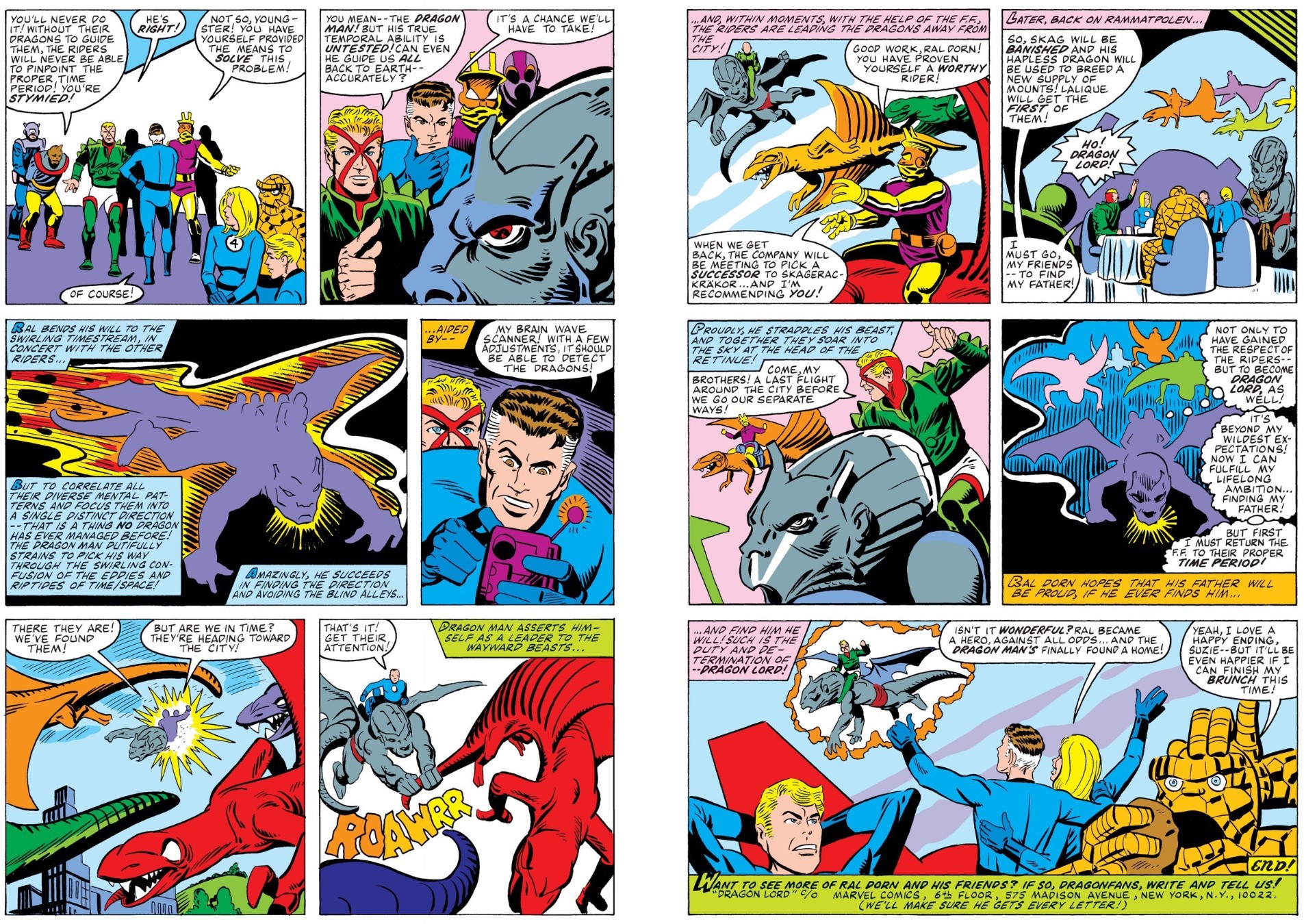 Days later the fugitive breaks into their skyscraper home and with the Staff holding the FF at bay explains his predicament. A novice lawkeeper, his dream of bonding with a dragon has been shattered by the death of his destined beast-partner, and accusations that he’s responsible. The wild story is inadvertantly backed up by a posse of Dragon Riders seeking to stop him and the intervention of Ral’s bizarre former ally Lalique. When they are driven away, it is clear to the human heroes that something is not kosher and they determine to help him. It’s obvious to Ral that his boss Dragon Lord Skagerackäkor is behind the plot but without a bonded beast what can he do? That’s why he was on campus. He had learned of former FF foe Dragon Man and decided that needs must when the devil drives…